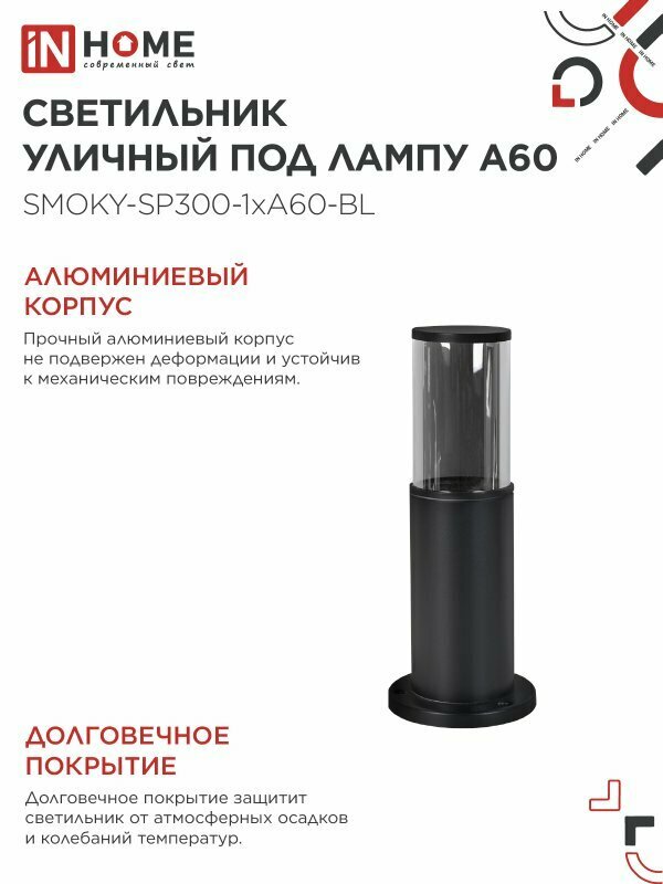 Светильник уличный напольный ТБУ SMOKY-SP300-1xA60-BL алюминиевый 300мм черный IP54 IN HOME информация: