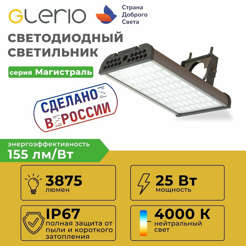 Светильник светодиодный Glerio уличный 25Вт с универсальным креплением 3875лм, 155 лм/Вт, IP67, 4000К информация: