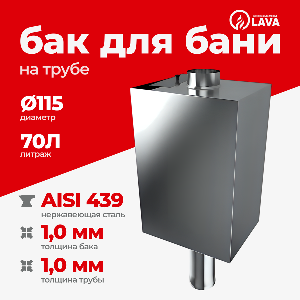 10 цен на Бак LAVA для бани на трубе 70 литров, d115, AISI 439 1,0 мм, МП