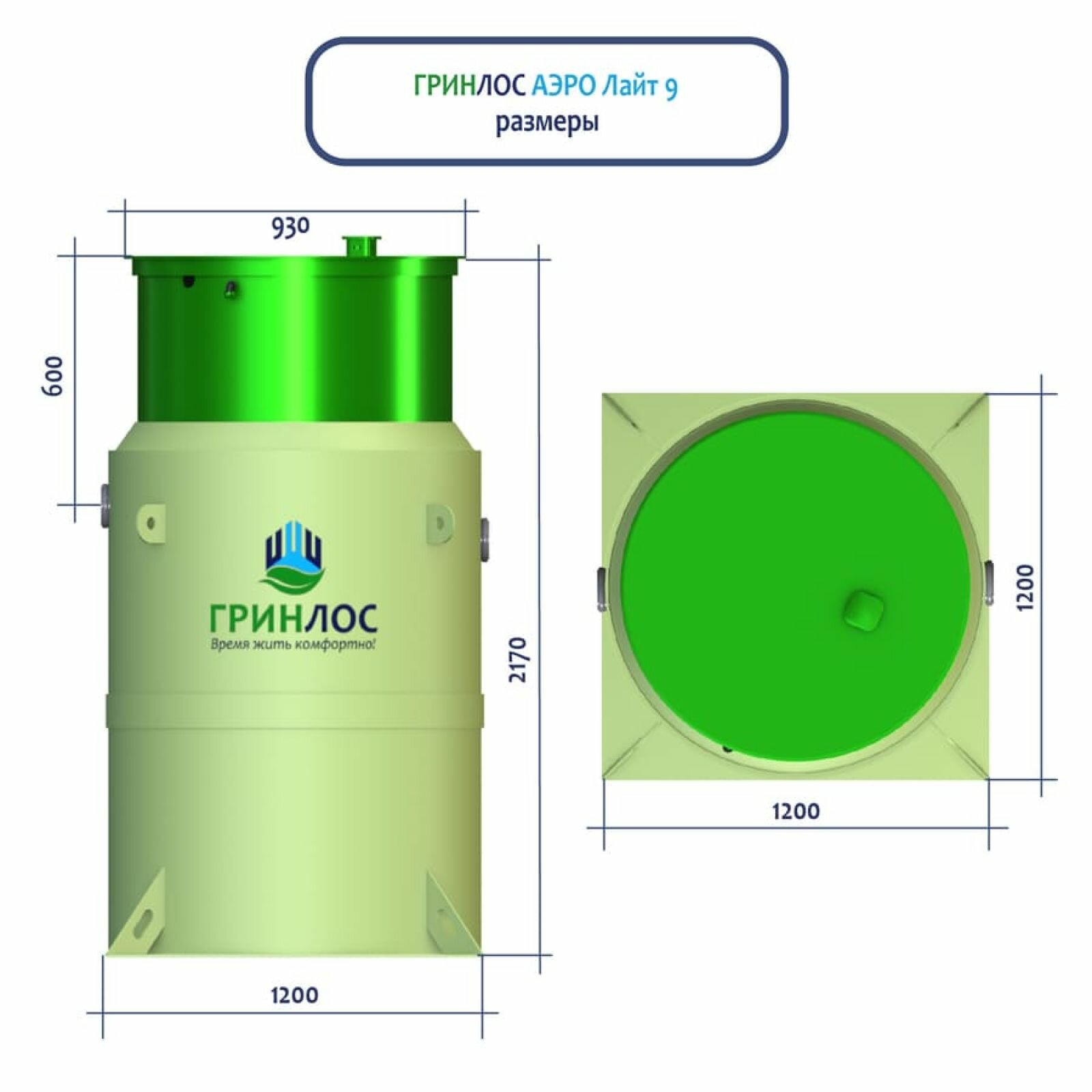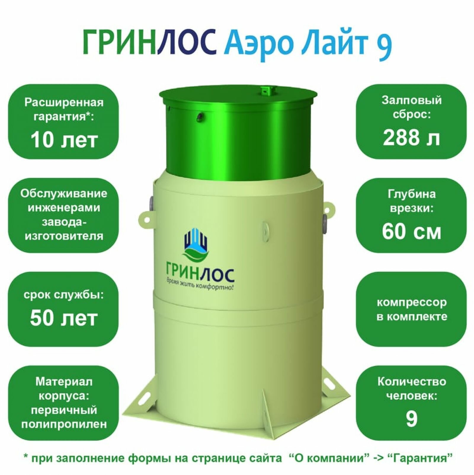 Септик для дома Гринлос Аэро Лайт 9 (1.62 м3/сут, самотечный, на 9 человек) информация: