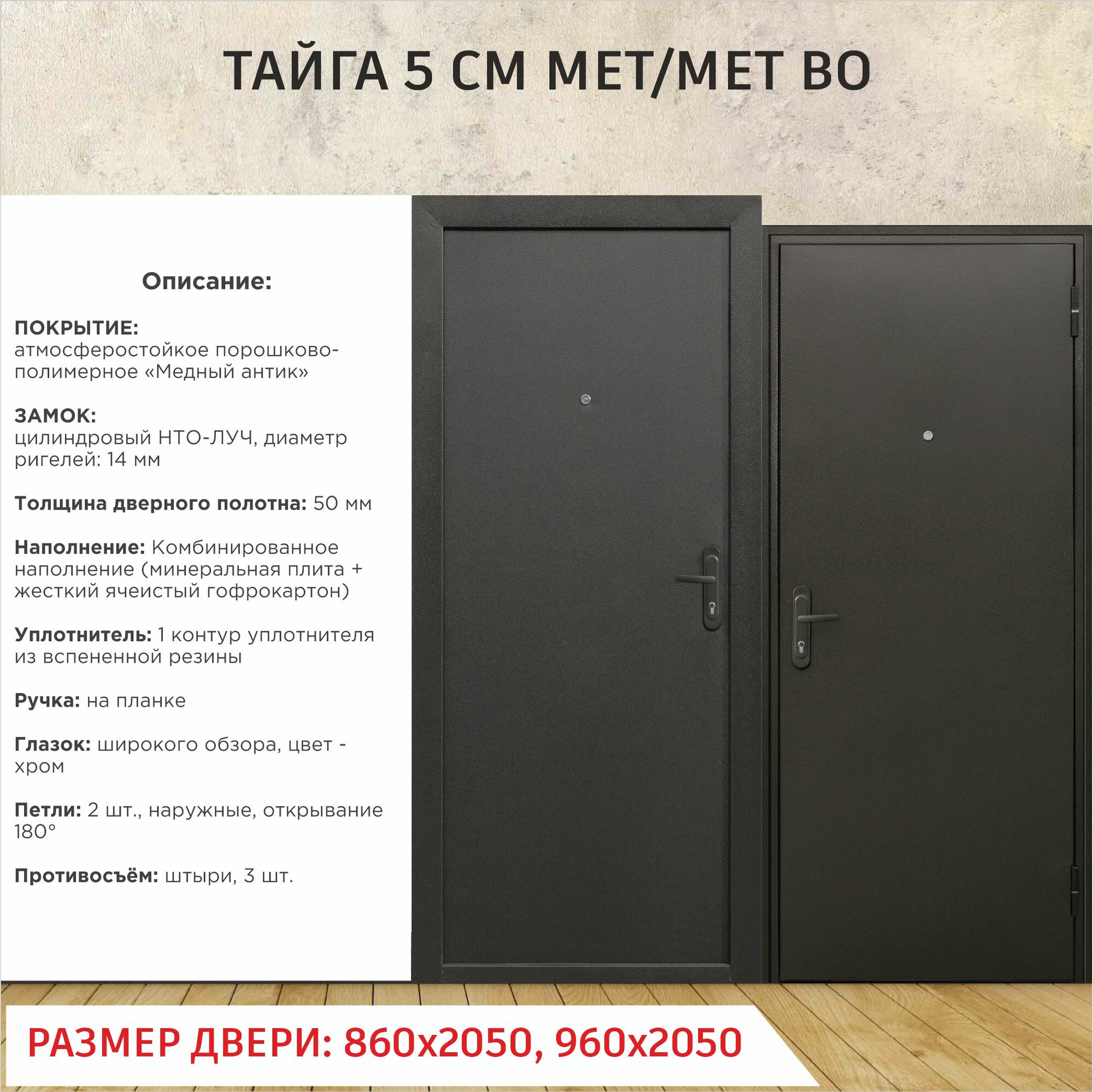 Дверь входная металлическая тайга 5 см Медный антик мет/мет внутреннее открывание 2050х960 Левая информация: