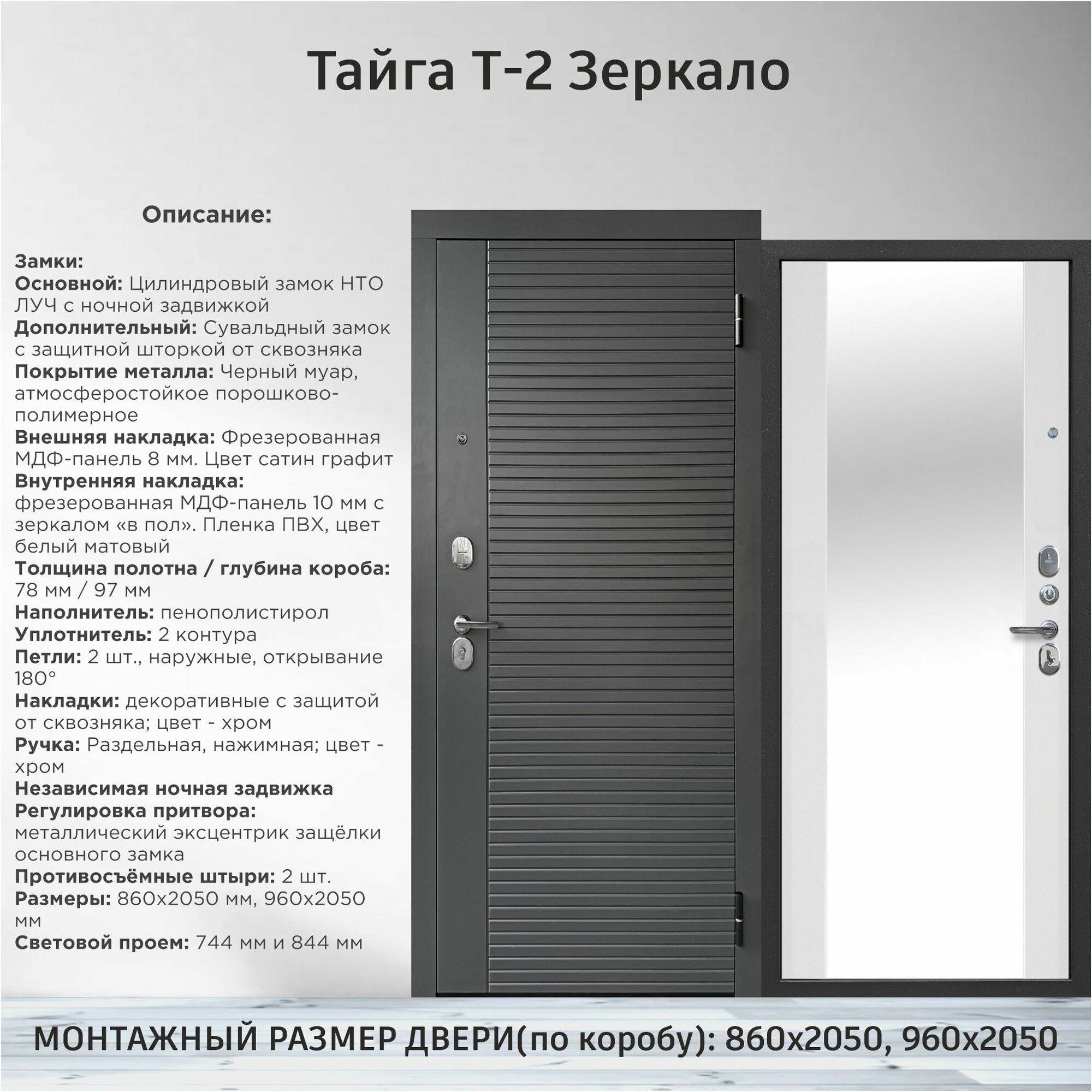 Дверь входная металлическая Тайга Т-2 Зеркало 2050х860 Правая Графит - Белый матовый информация: