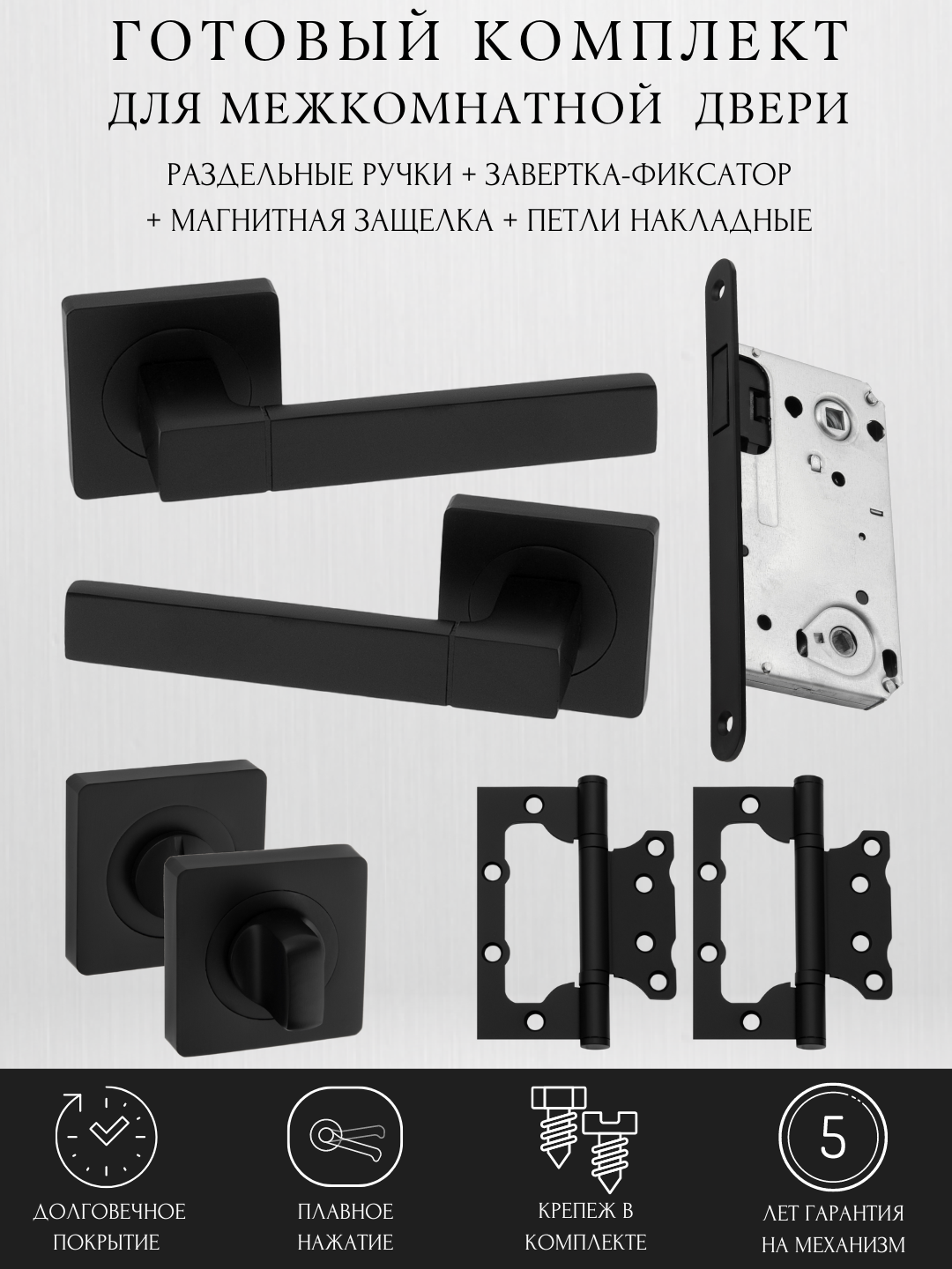 Ручка дверная межкомнатная, с магнитной защелкой +завертка +петли бабочки, цвет черный матовый, квадратные, комплект информация: