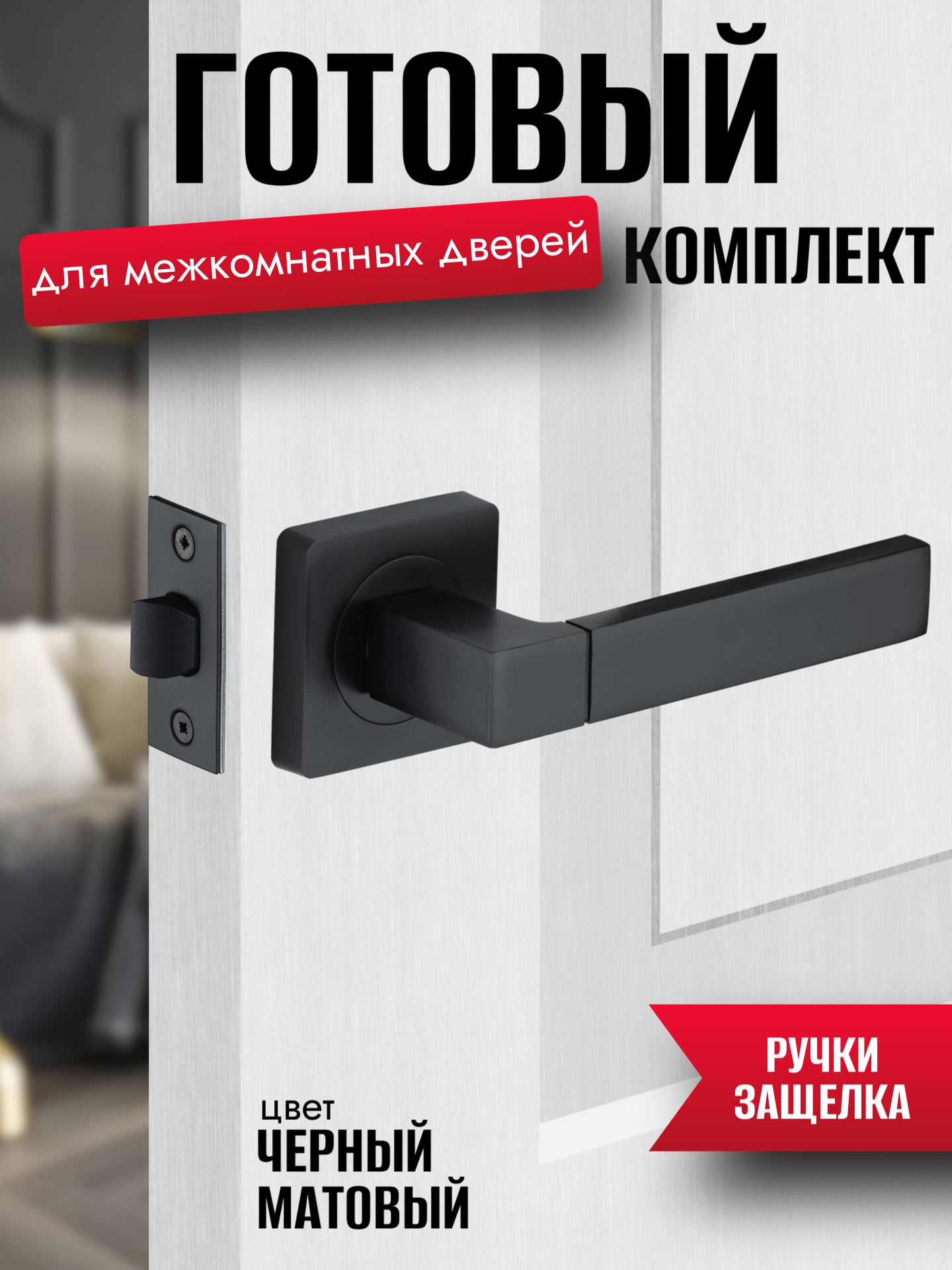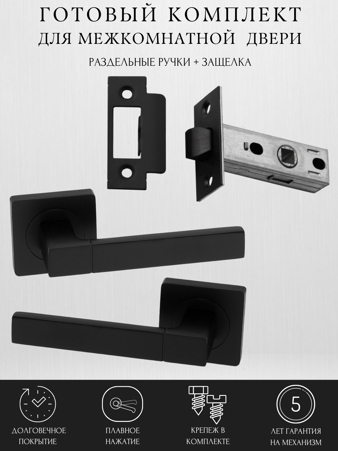 Ручка дверная межкомнатная, с защелкой, цвет черный, квадратные, комплект информация: