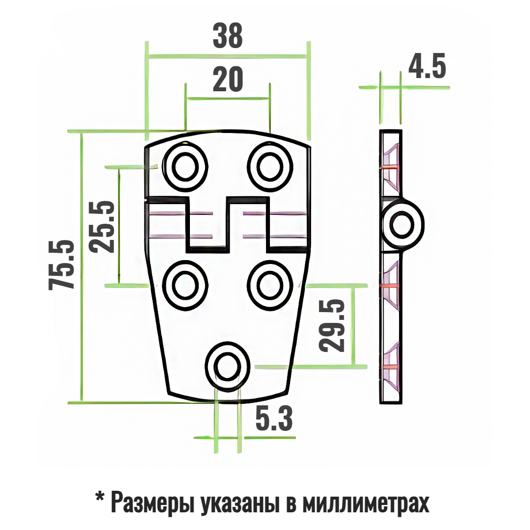 Петля из нержавеющей стали, хромированная, трапециевидная 38x75,5х4.5 мм. Петля полированная, универсальная для яхт, катеров, лодок, ванной информация: