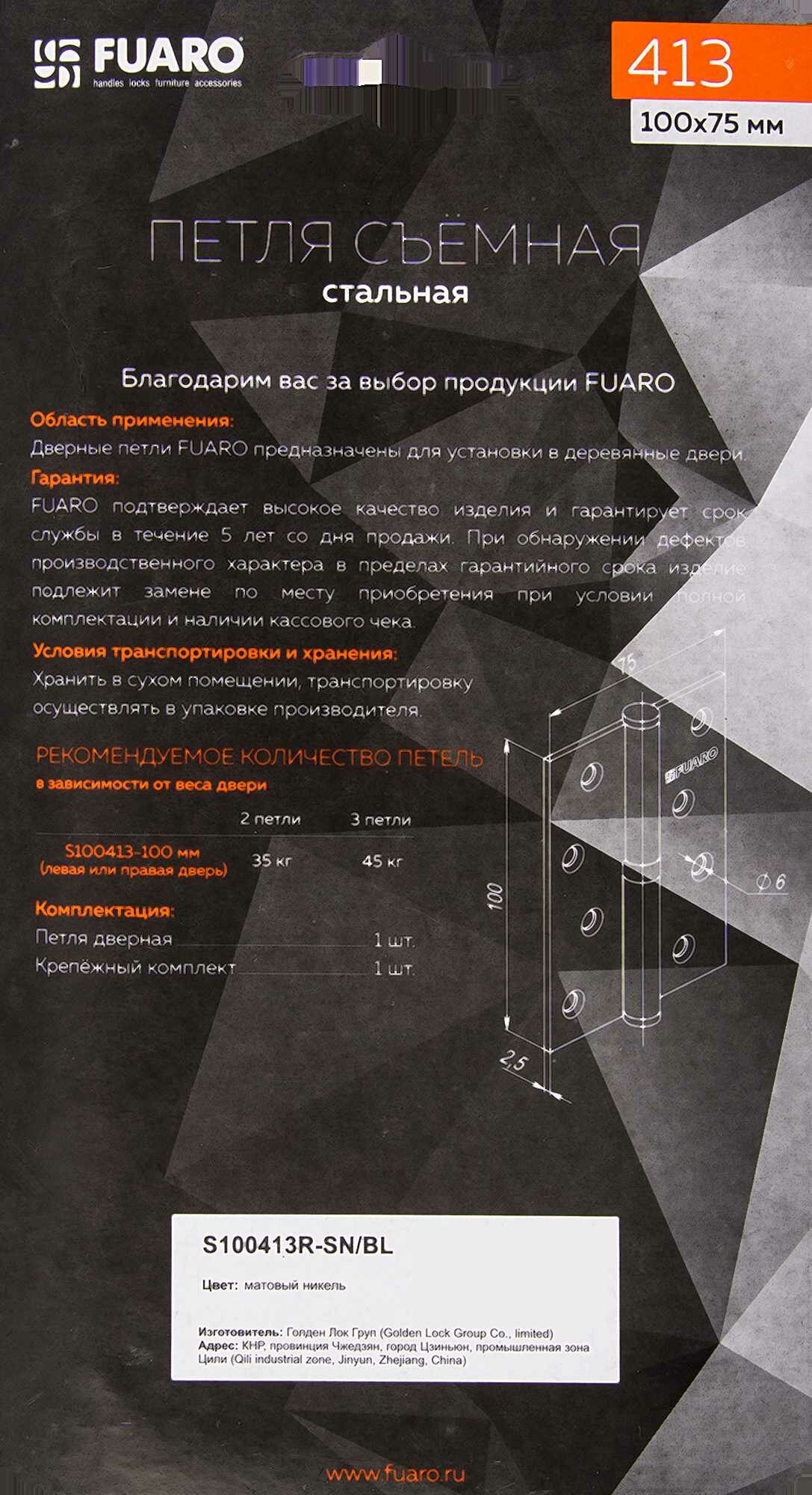 Петля съемная Fuaro 413/BL-4 правая 100x75x2.5 мм цвет матовый никель информация: