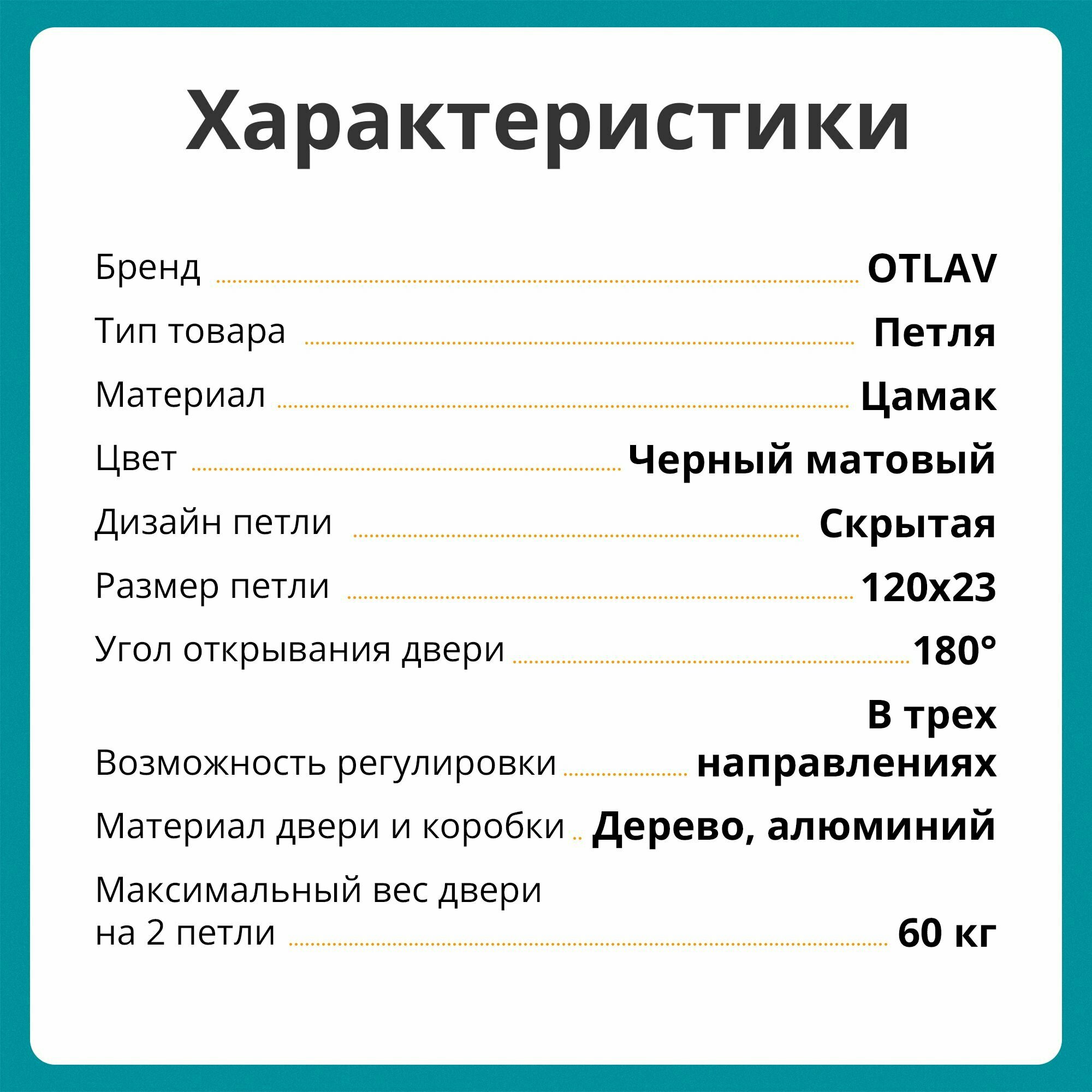 Характиристики этого товара не найдены!Отзывы на Петля скрытая Otlav, 3D, универсальная, 120x23 мм, 60 кг, с 4 накладками, черный матовый
