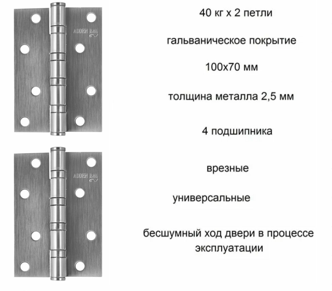 Характиристики этого товара не найдены!Отзывы на Петли дверные Универсальные врезные на 4-х подшипниках ADDEN BAU, 4ВВ, 100х70х2,5 MATTE SATIN CHROME (Матовый хром) комплект из 2 шт.