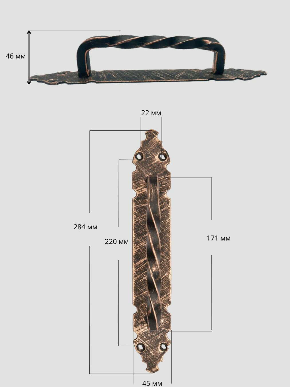 Ручка-скоба дверная кованая "Витая на планке" цвет: медный/межосевое расстояние: 170 мм/металлическая информация: