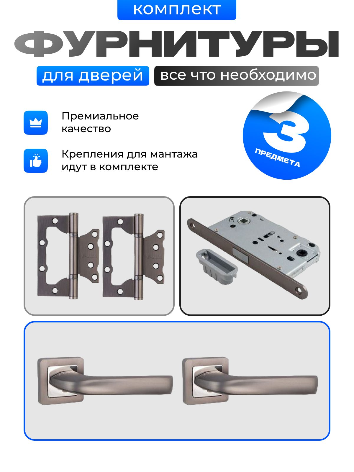 Отзывы на Комплект для межкомнатных дверей S-Locked; ручка дверная+ петли неврезные бабочка/ + защелка-замок магнитный.
