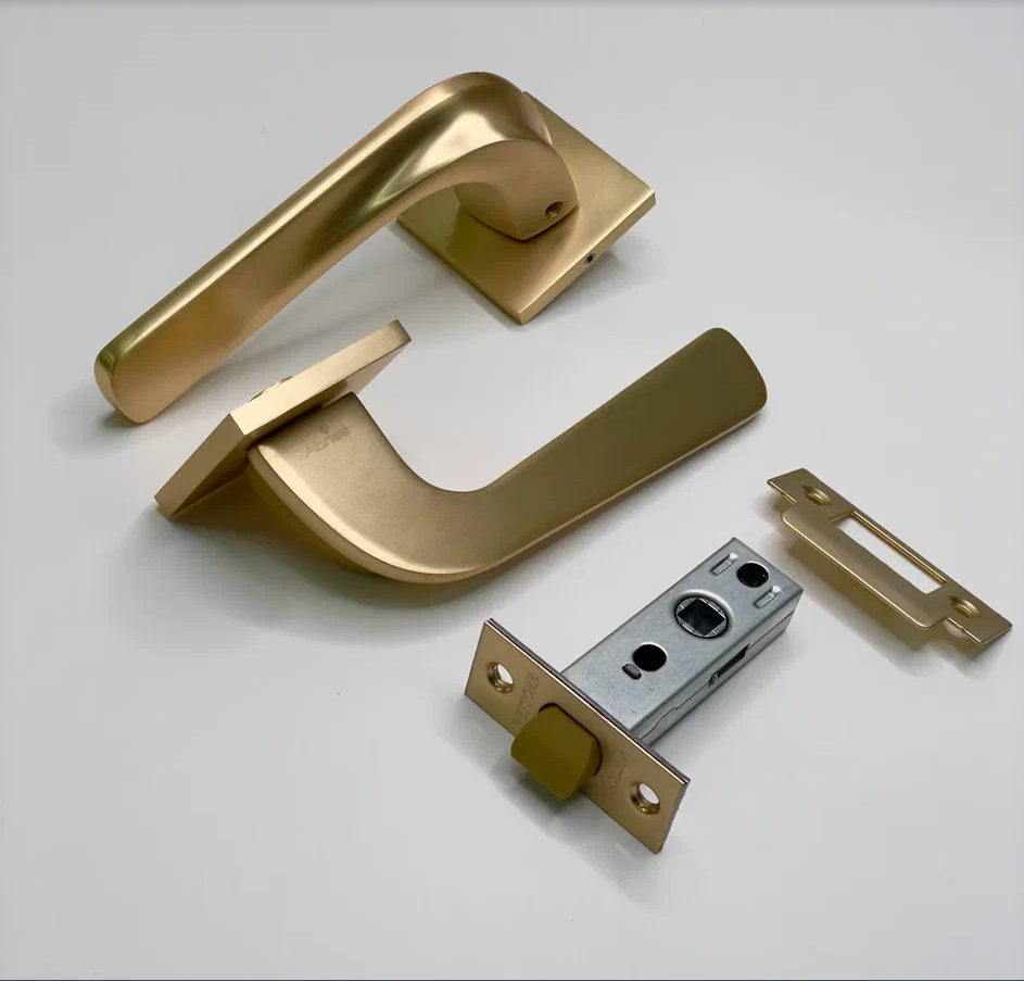 Отзывы на Комплект для межкомнатной двери Ручка R21.177 SSG + Защелка замок врезной C-03B 100 KEVLAR SSG Сатинированное золото