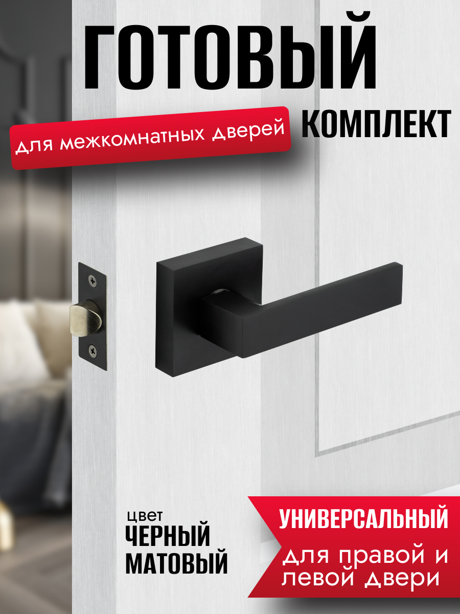 Ручка дверная межкомнатная с защелкой, цвет черный, квадратная розетка, комплект информация: