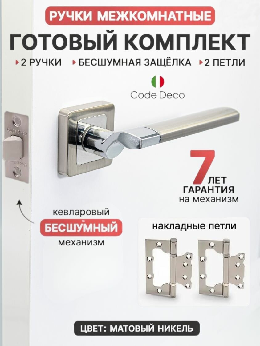 Готовый комплект 4в1 ручка дверная межкомнатная CODE DECO 22092 Матовый никель + защелка без фиксации + петли накладные (2 шт) информация: