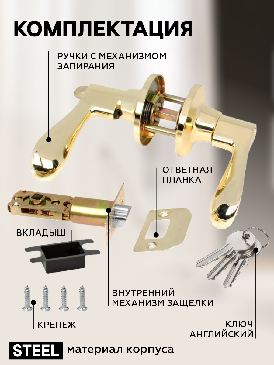 Ручка дверная межкомнатная хром блестящий с защелкой, заверткой и ключами комплект