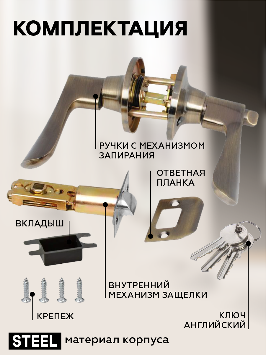 Ручка дверная межкомнатная хром блестящий с защелкой, заверткой и ключами комплект