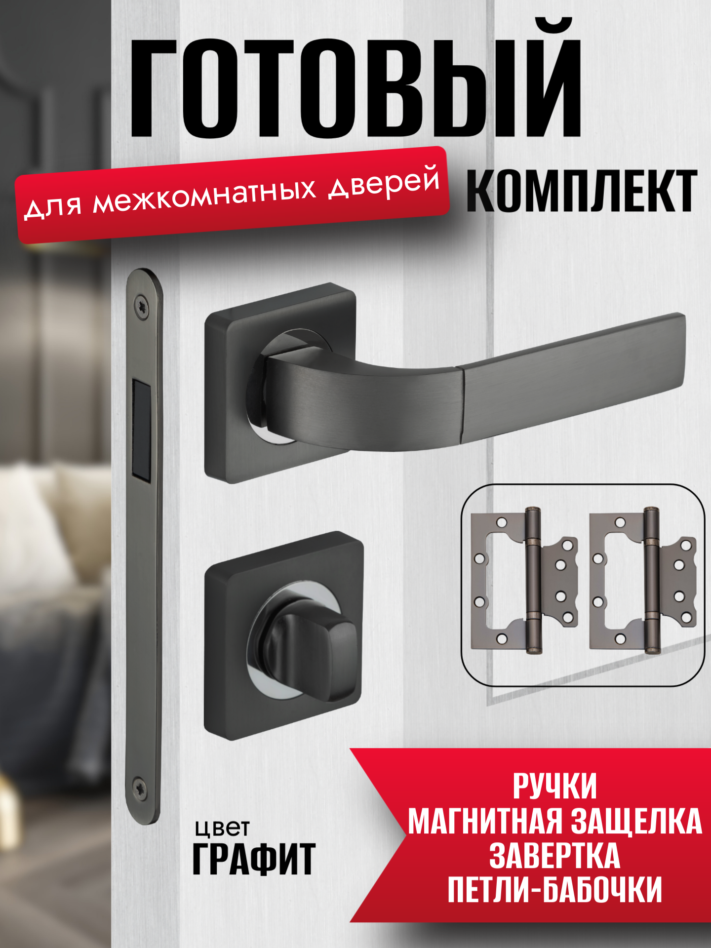 Ручка дверная межкомнатная, с магнитной защелкой +завертка +петли бабочки, цвет графит, квадратные, комплект информация: