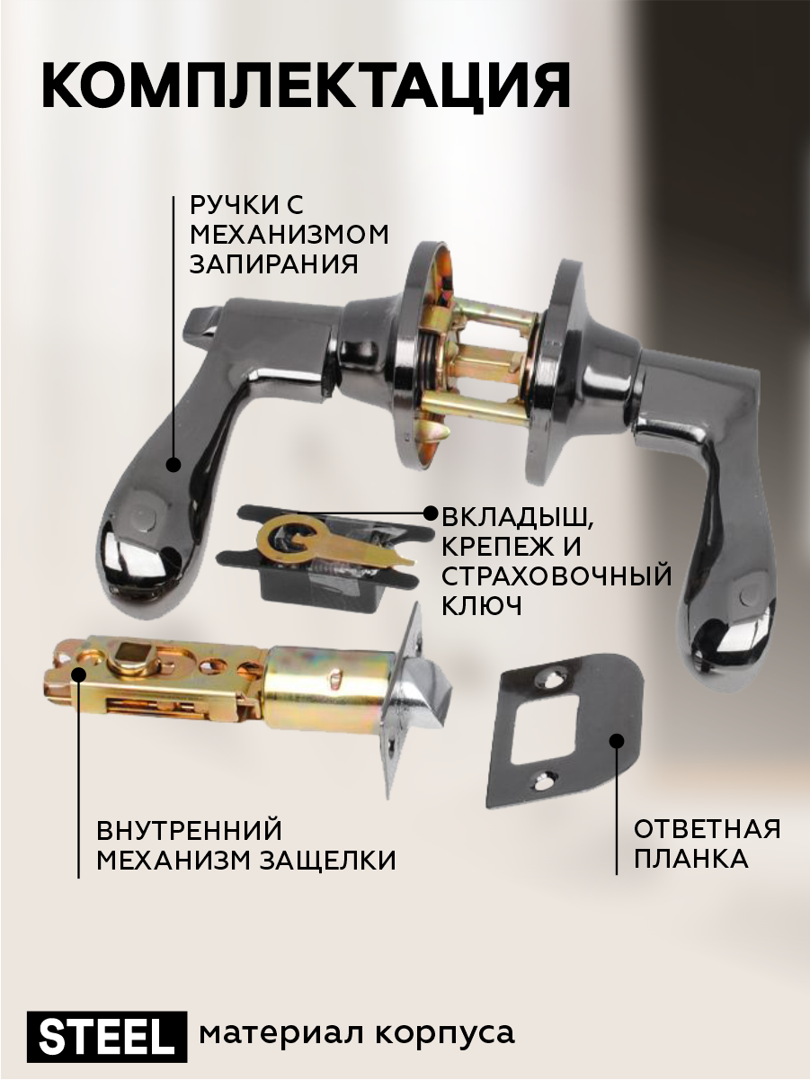 Ручка дверная межкомнатная хром блестящий с защелкой, заверткой и ключами комплект