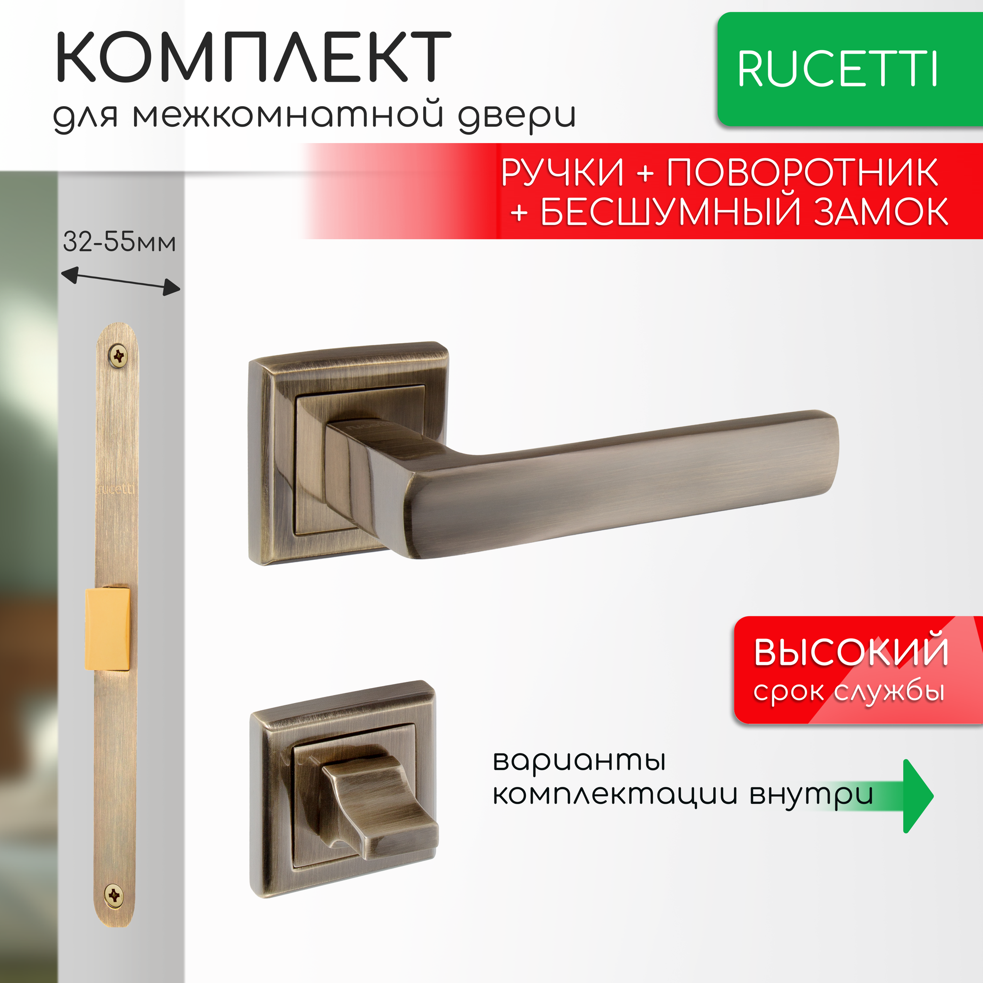 Комплект для межкомнатной двери Rucetti ручки RAP 14 S AB + фиксатор + бесшумный замок / античная бронза информация: