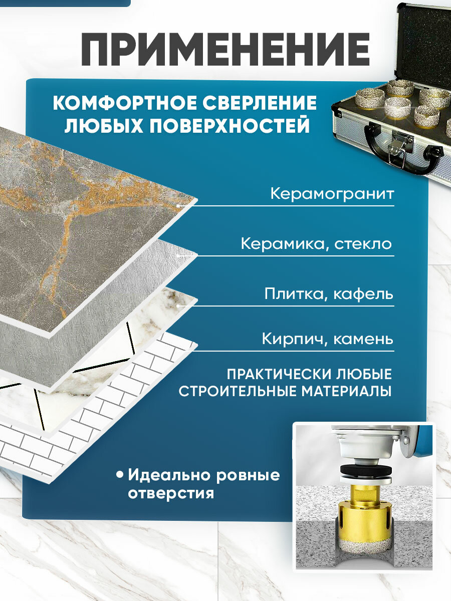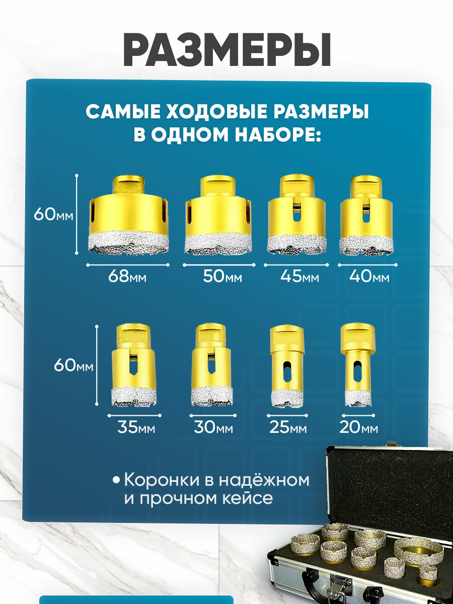 Набор алмазных коронок 8 шт М14 по плитке керамограниту камню, мокрый сухой рез информация: