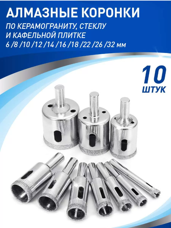 Набор коронок алмазных 10 штук, по керамической плитке, стеклу, керамограниту информация: