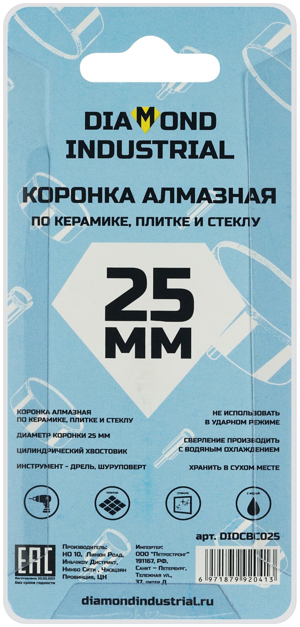 Алмазная коронка по керамике, плитке и стеклу 25 мм Diamond Industrial информация:
