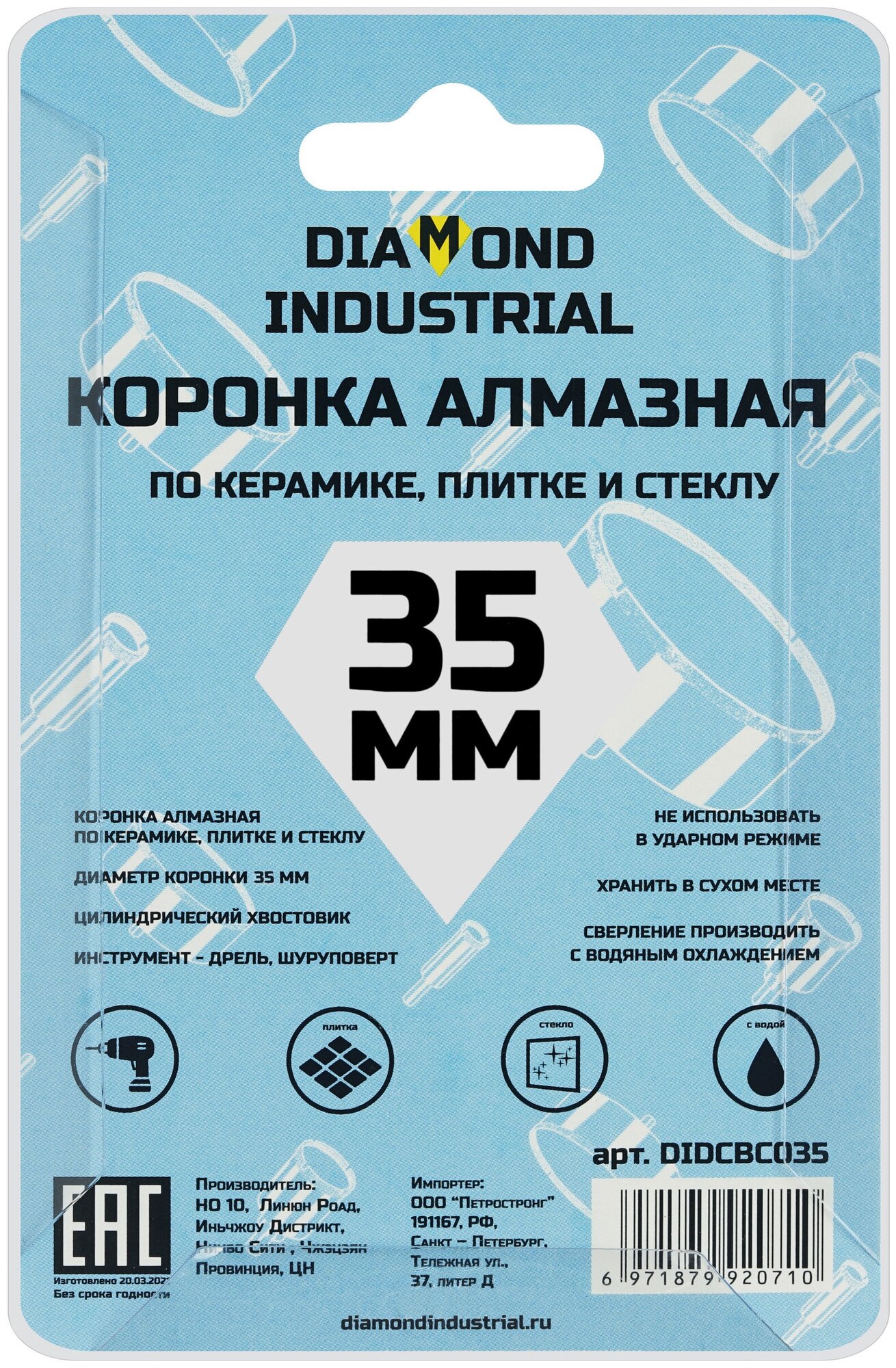 Алмазная коронка по керамике, плитке и стеклу 35 мм Diamond Industrial информация: