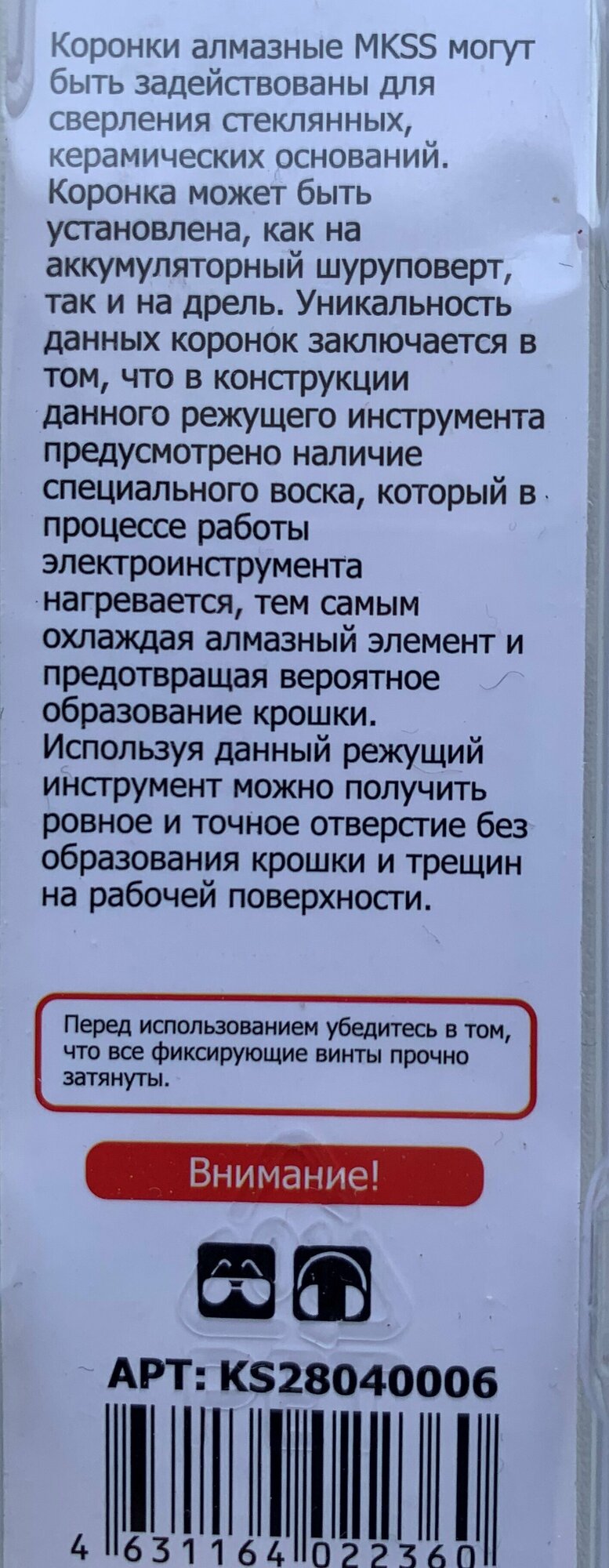 Коронка алмазная 10мм с воском по керамограниту MKSS информация: