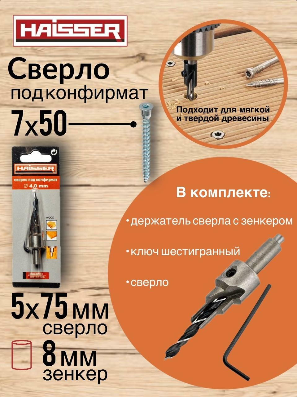 Сверло под конфирмат 7 х 50 диаметр 5 мм длина 75 мм зенкер 8 мм информация: