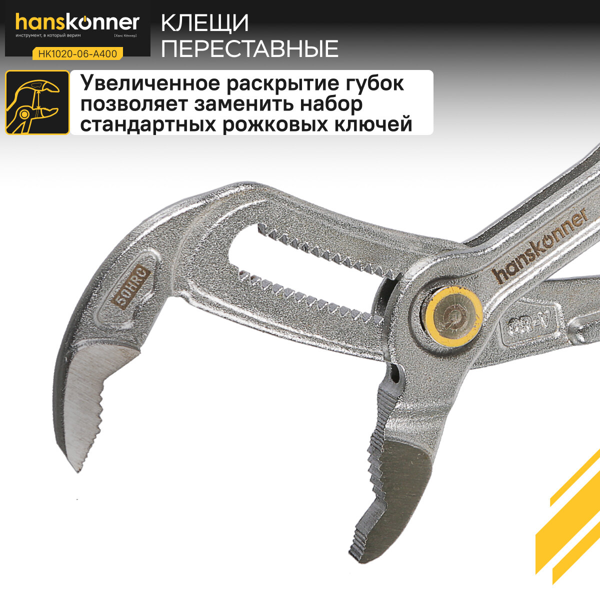 Клещи переставные Hanskonner HK1020-06-A400 400мм, CrV, кнопочный шарнир, раскр. губ. 90мм(>13%) информация:
