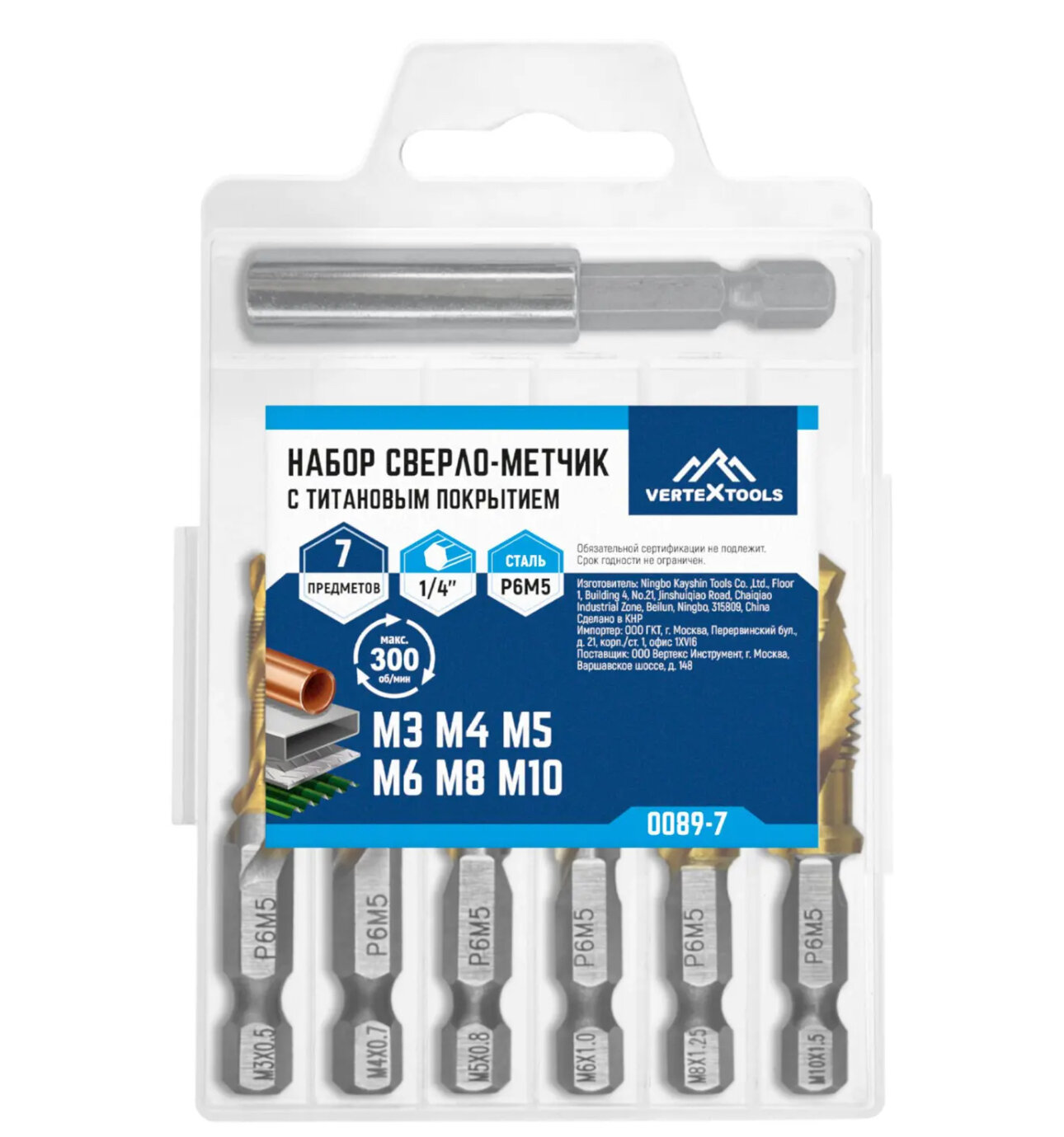 Набор сверл-метчиков по металлу Vertextools 0089-7, 7 шт. Сверло-метчик с титановым покрытием, набор из 7 штук информация: