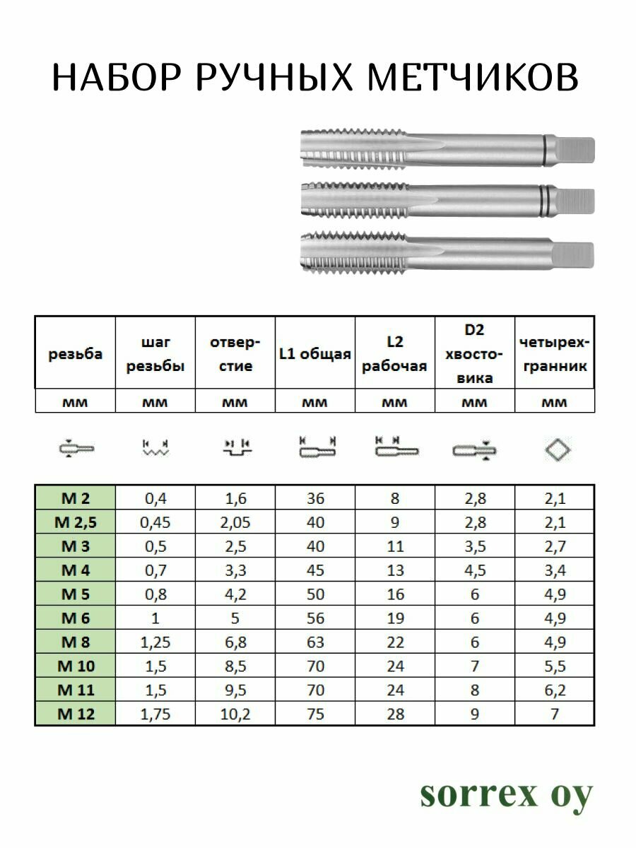 Отзывы на Метчики ручные M2 набор 3 шт из быстрорежущей стали DIN 352 6H для нарезания метрической резьбы по металлу, глухие и сквозные отверстия 00105080-S Sorrex