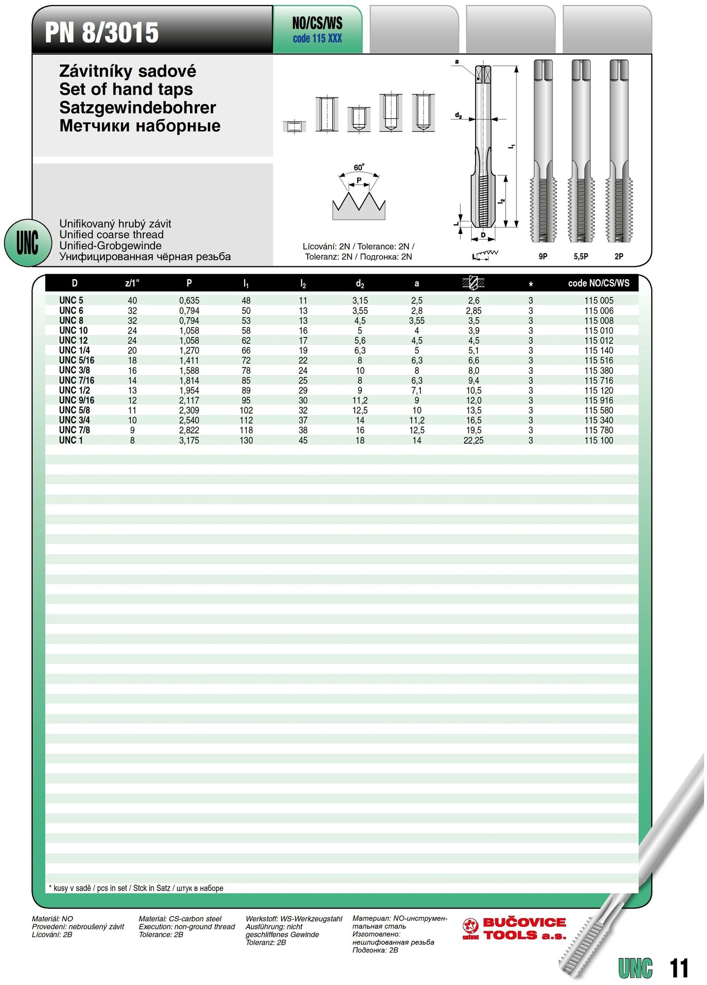 Метчик Bucovice(CzTool) 1/4" -20-UNC (Комплект 2шт) 115CrV3 PN8/3015 2B 60° 115140-2 информация: