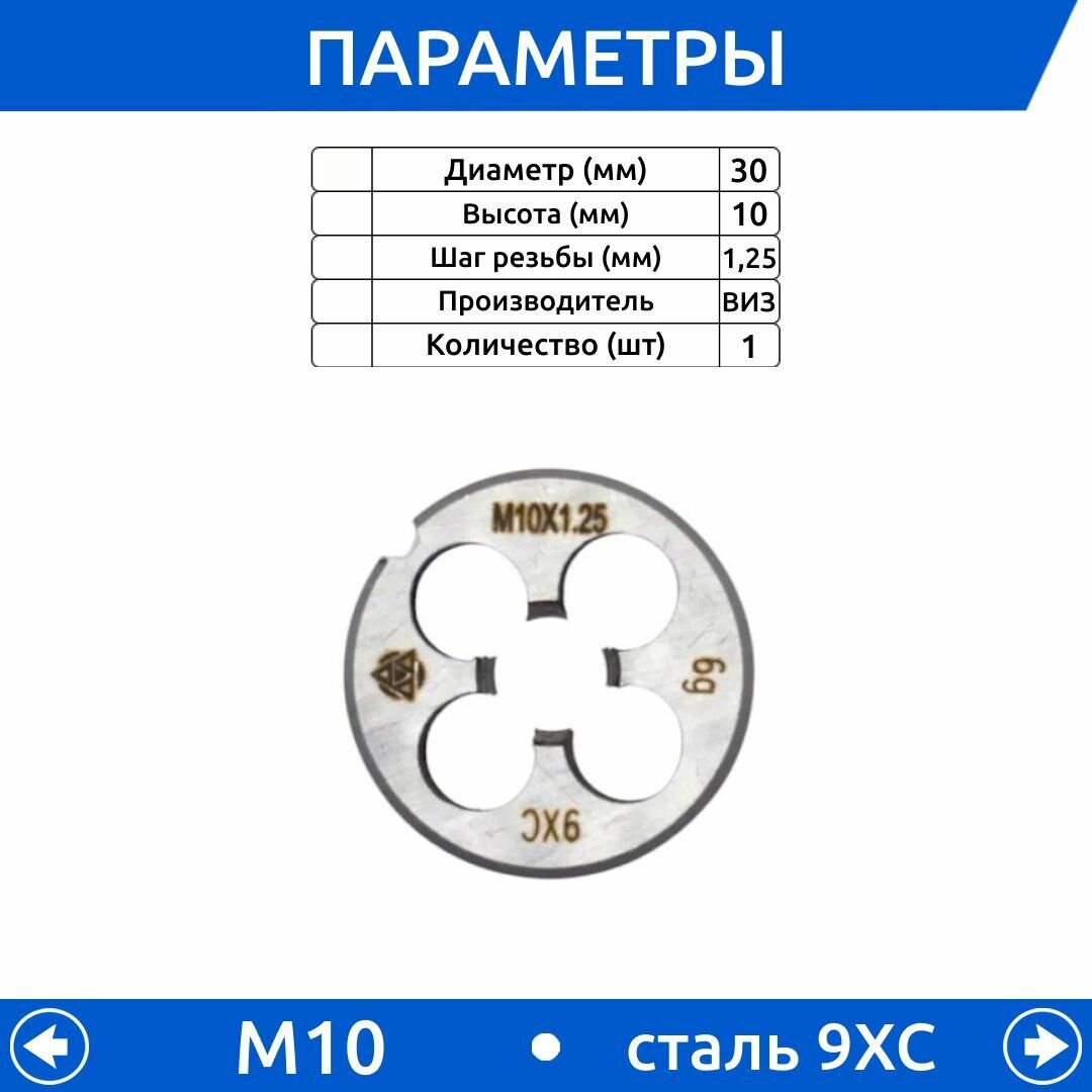 Плашка М10 шаг 1,25 9ХС ВИЗ, 1 шт информация: