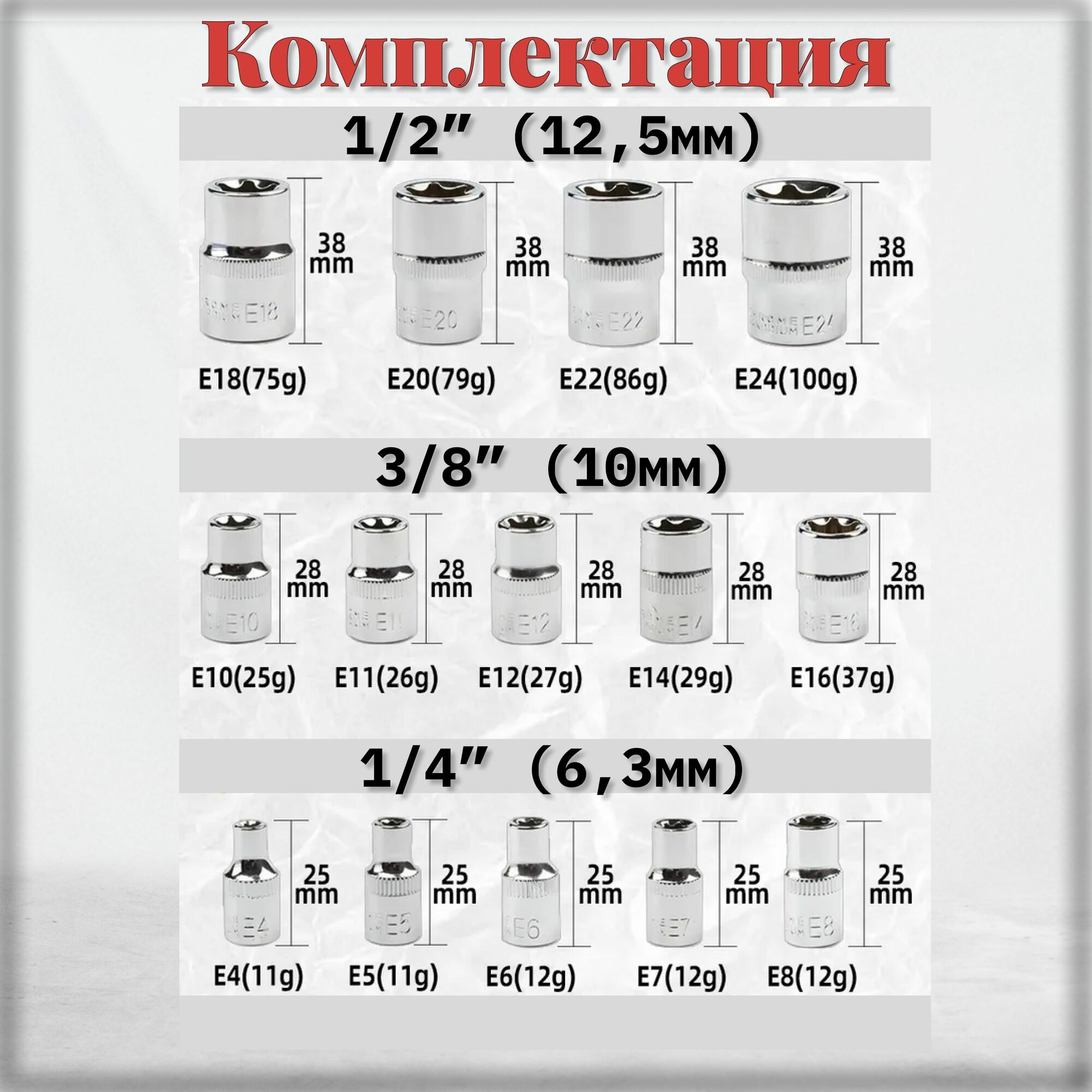 Набор торцевых головок АвтоХит "Е-профиль", металл, хром-ванадий, 14 штук информация: