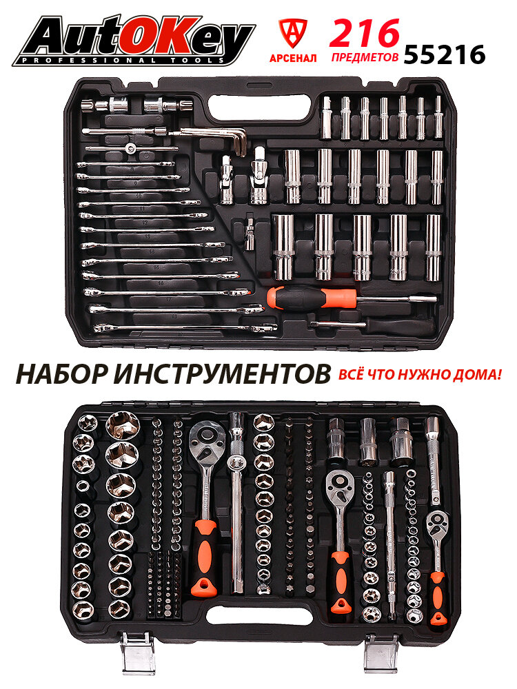 Набор инструментов 216 предметов (1/2", 1/4", 3/8" ключи, головки, биты, кейс) AutOkey, 55216 информация:
