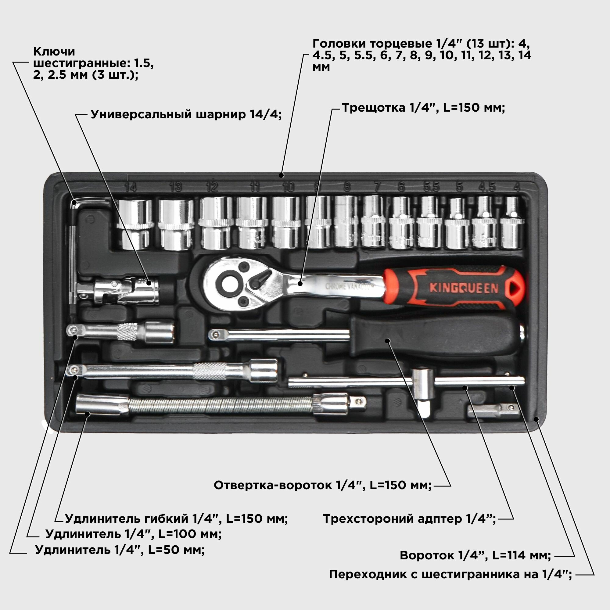 Набор инструментов KINGQUEEN, хромованадиевая сталь, 46 элементов, 72 зубца информация: