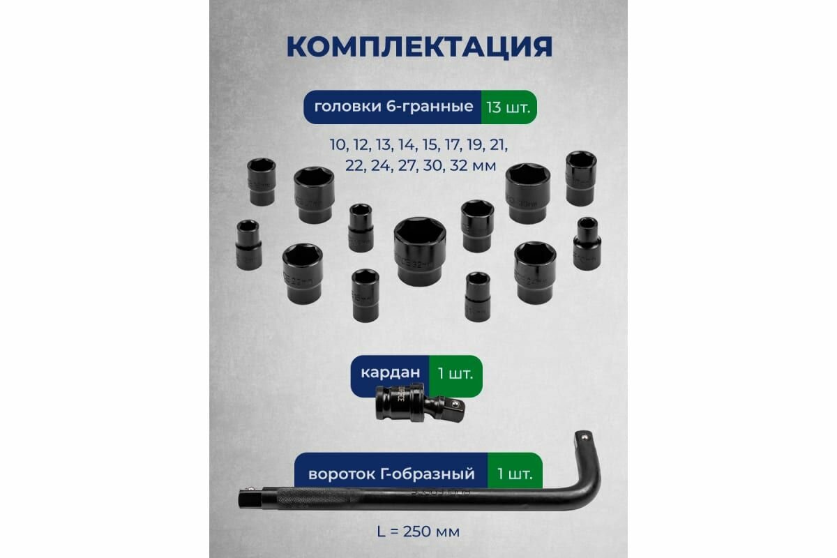Отзывы на Набор головок ударных для гайковерта RockForce 15 предметов 10-32мм 1/2 в ложементе
