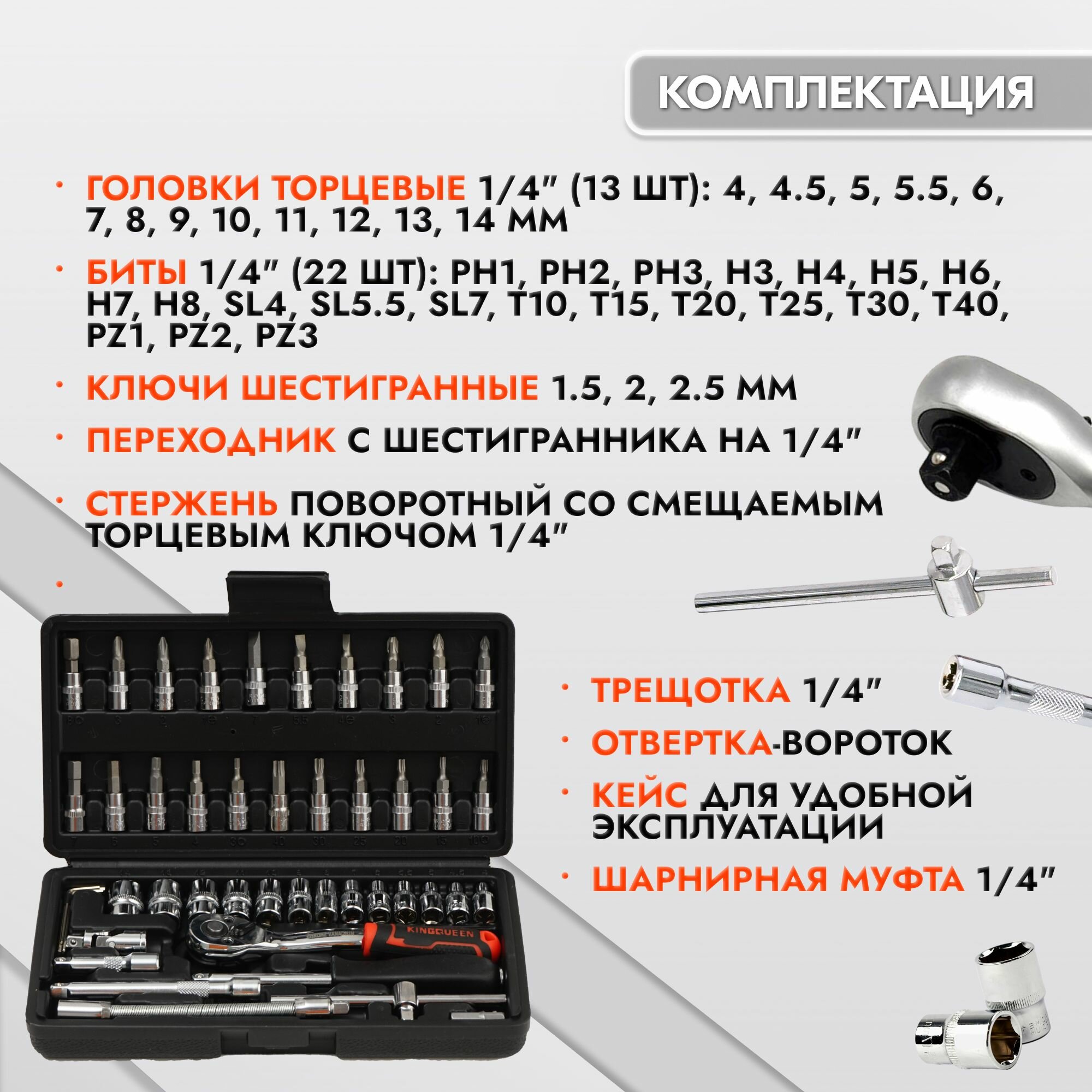 Набор автомобильных инструментов KINGQUEEN, 46 элементов, в кейсе информация: