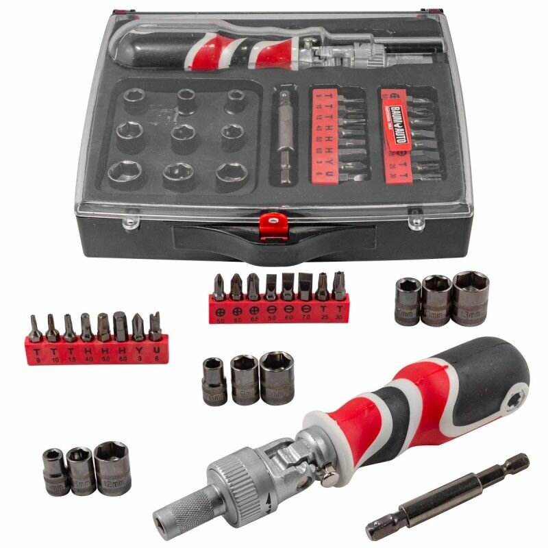 10 цен на Отвертка реверсивная поворотная, усиленная с комплектом бит и головок (27 шт.) в пластиковом футляре.
