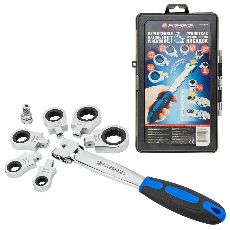 Набор ключей трещоточных сьемных с рукояткой (+ адаптер под квадрат 3/8"), в пластиковом кейсе Forsage информация: