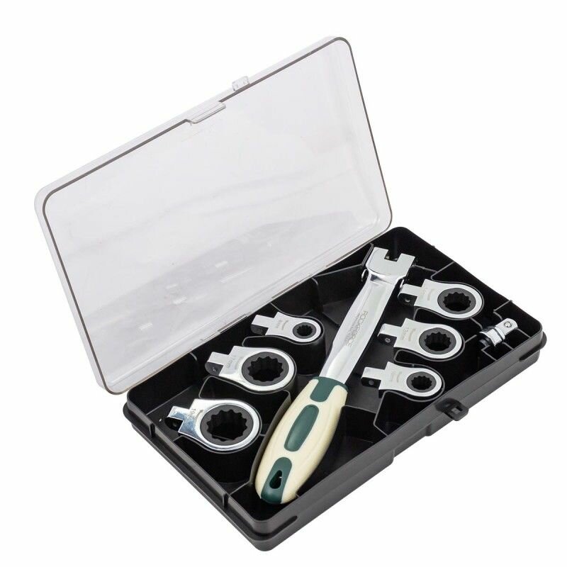 10 цен на Набор ключей трещоточных сьемных с рукояткой (+ адаптер под квадрат 3/8") ROCKFORCE
