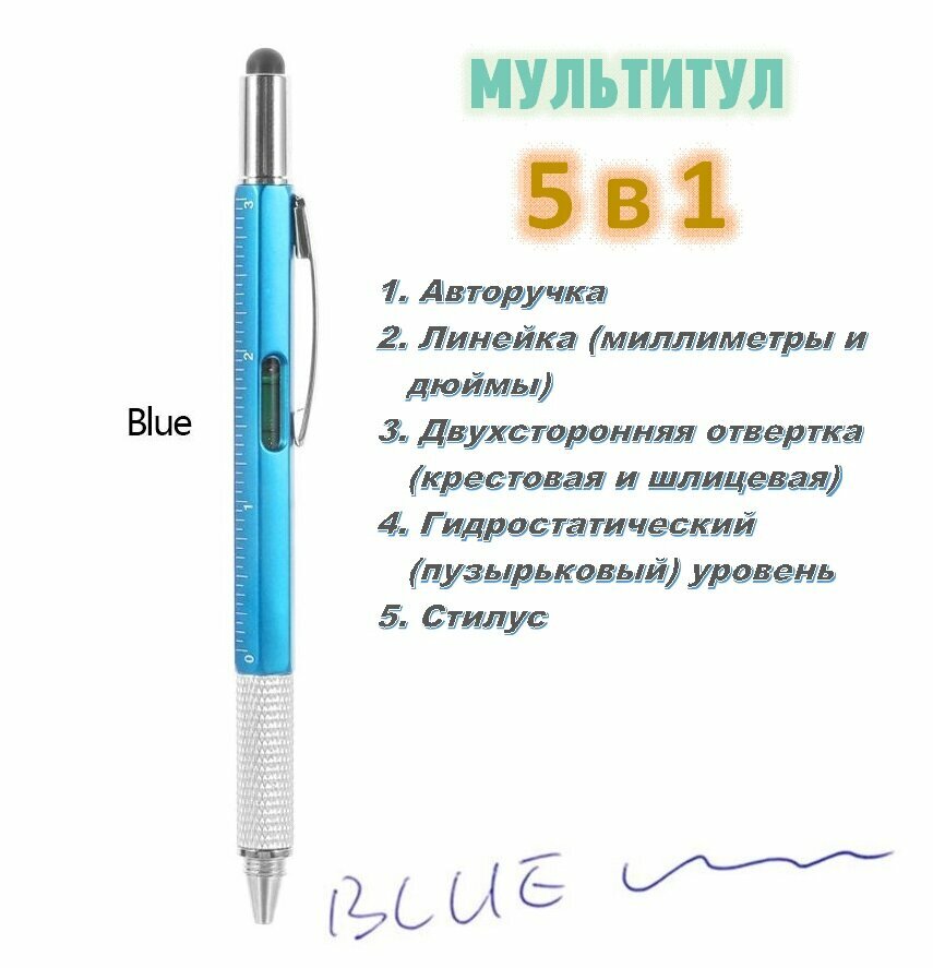 10 цен на Мультитул 5 в 1. Двухсторонняя отвертка с шариковой ручкой, уровнем, линейкой, и стилусом. Синий