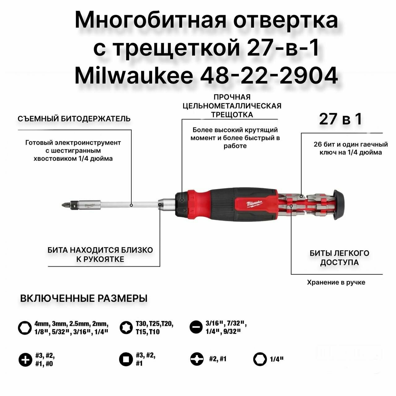 0 отзывов, средняя оценка 0. Чтобы купить «Многобитная отвертка с трещёткой 27 в 1 Milwaukee 48-22-2904» по лучшей цене мы сканируем авито, алиэкспресс, маркет, озон, савеловский, плеер, горбушку, беру, официальные сайты и находим минимальную. Администрация не несет ответсвенность актуальность цен на Многобитная отвертка с трещёткой 27 в 1 Milwaukee 48-22-2904, более подробно узнавайте на сайте магазина.