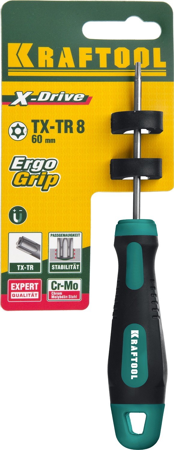 Отвертка, Cr-Mo-V сталь, двухкомпонентная противоскользящая рукоятка, TORX Hole, №8x60мм KRAFTOOL информация:
