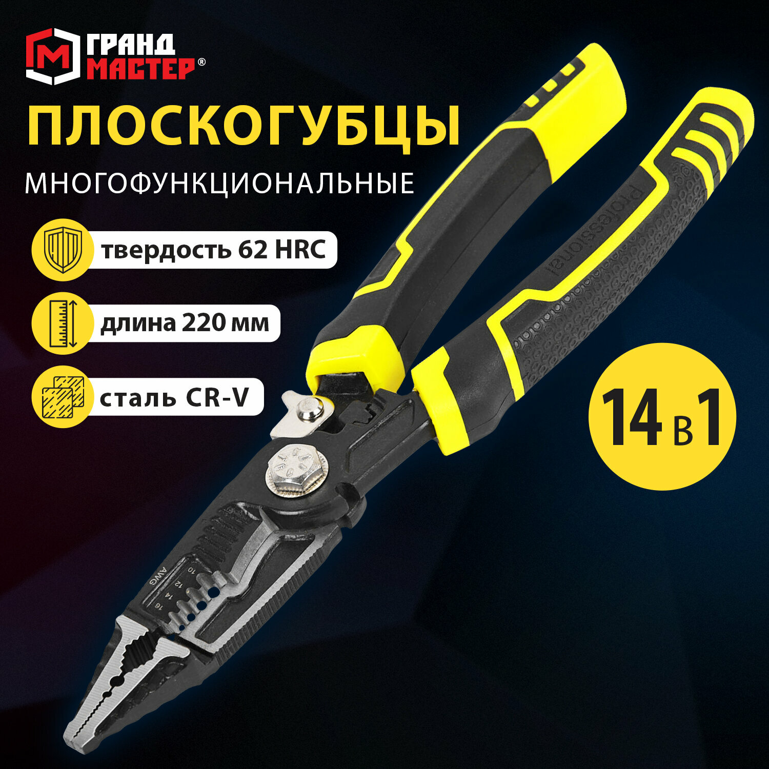 Плоскогубцы универсальные, пассатижи многофункциональные 14 в 1, 220 мм, CrV, хромванадиевая сталь, Грандмастер PL-220, 671257 информация: