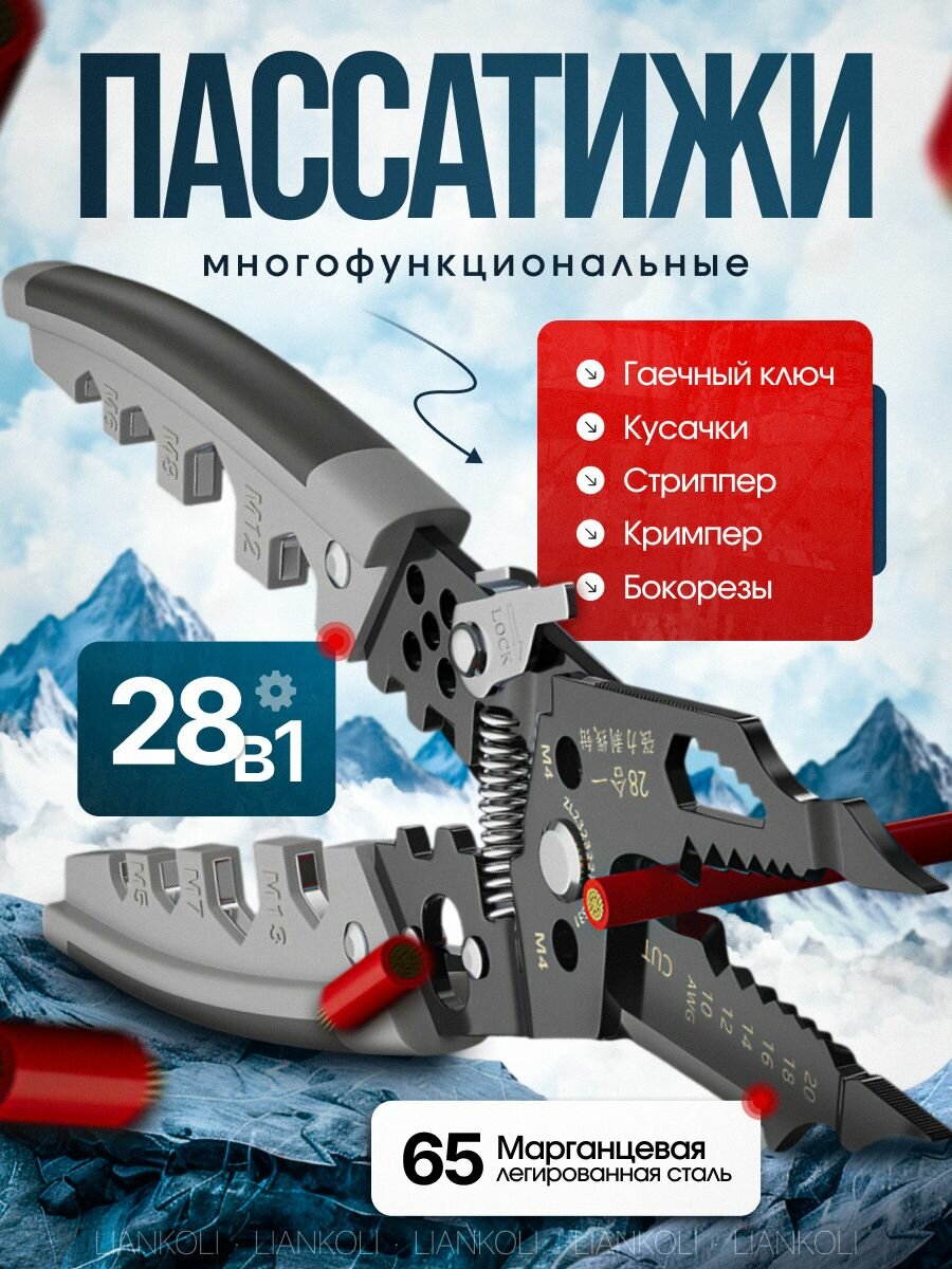 Плоскогубцы многофункциональные 28 в 1, Пасатижи многофункциональный, Стриппер для зачистки проводов, Мультитул, Liankoli информация: