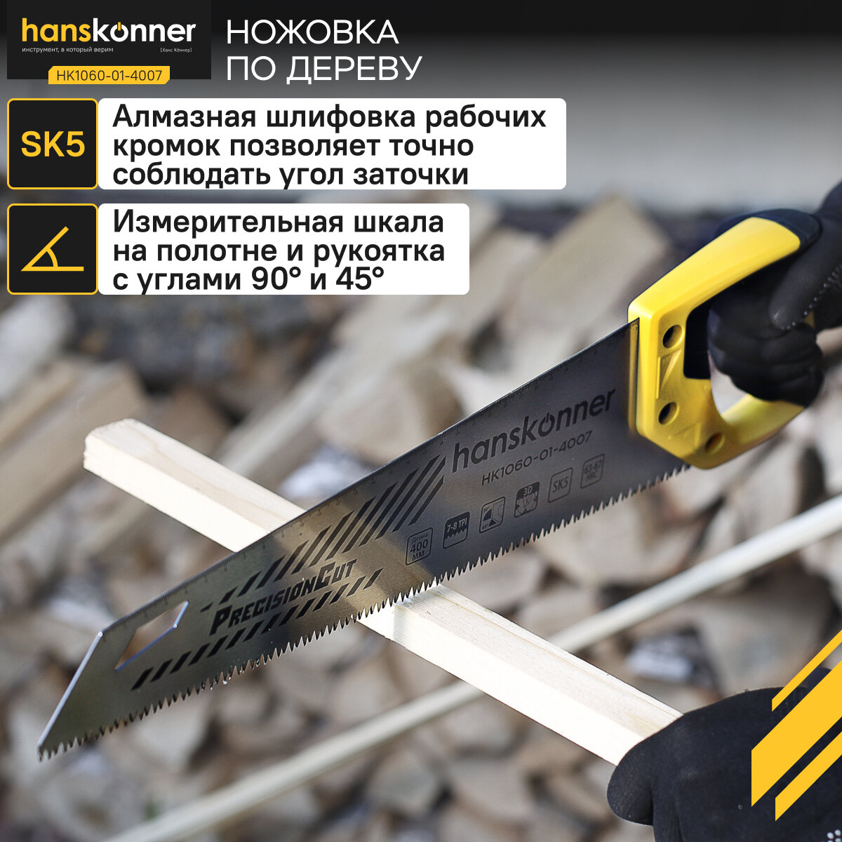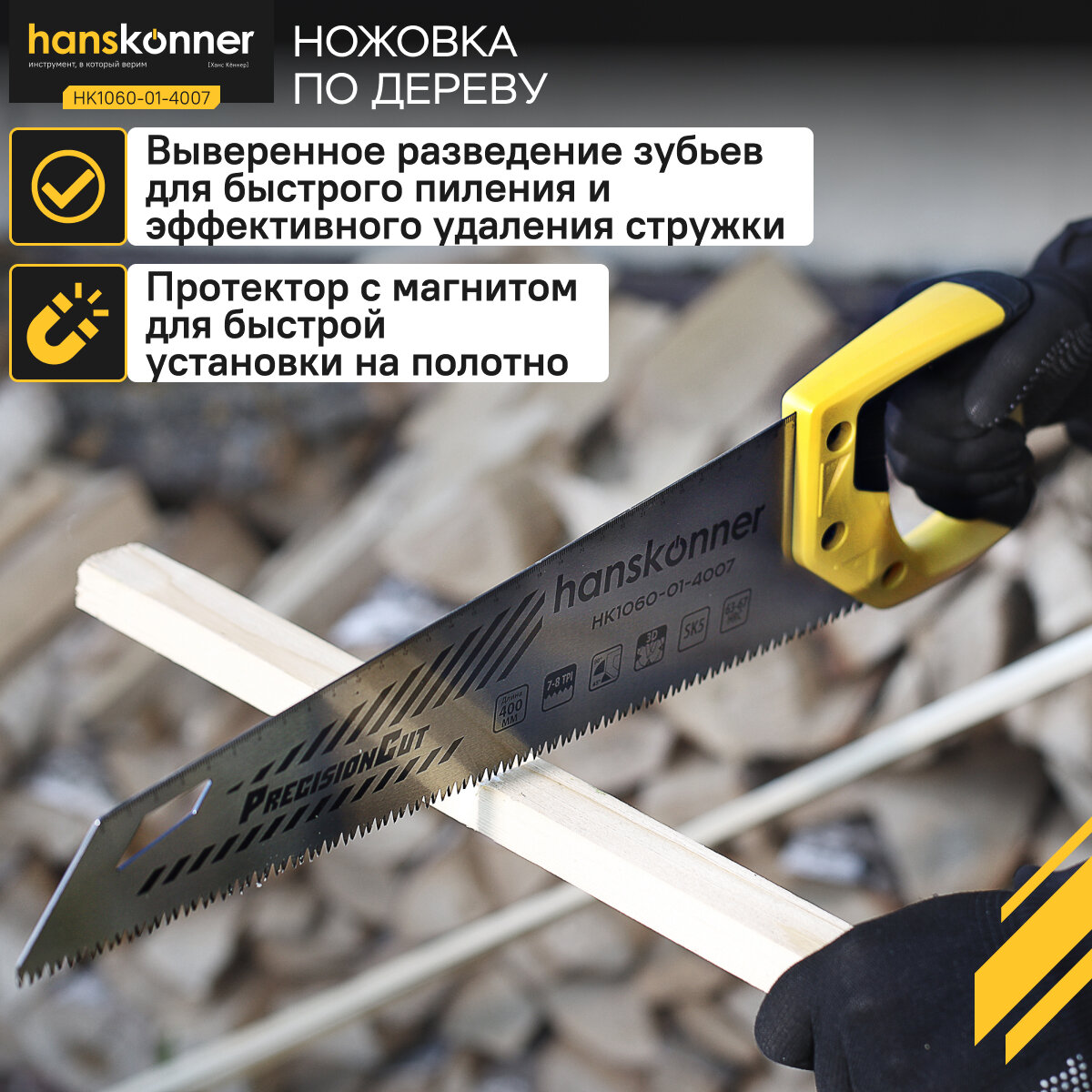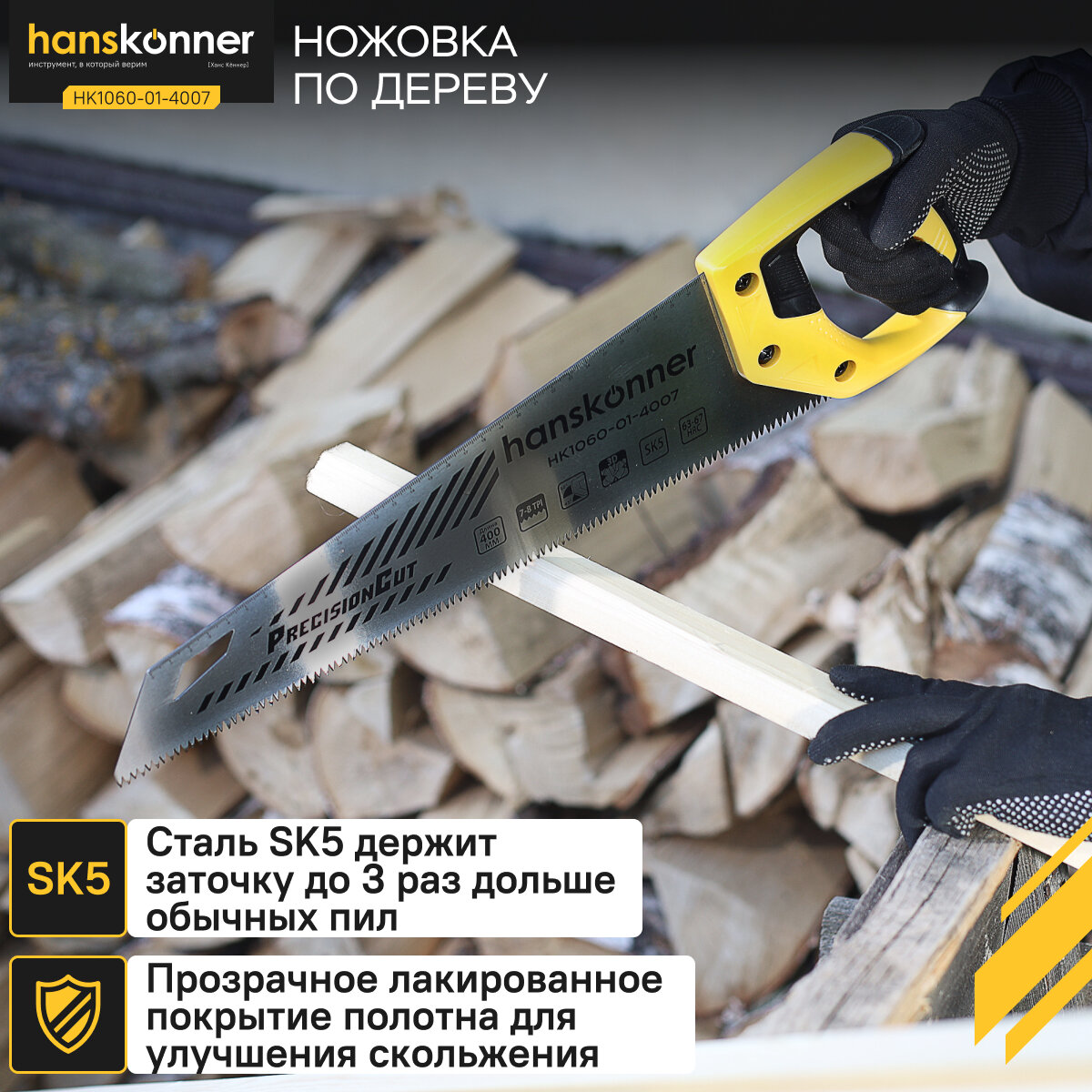 Ножовка по дереву Hanskonner HK1060-01-4007 400мм, 7-8 TPI, SK5, 3D зуб, чистый рез, информация: