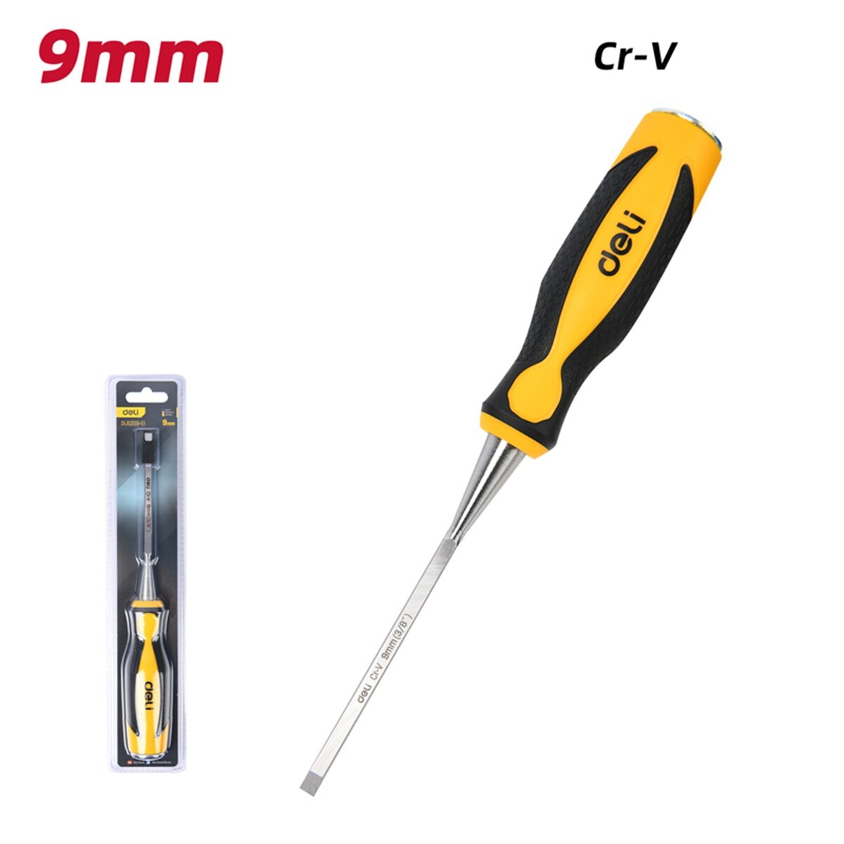 Стамеска плоская 9мм Deli DL6209-E1 (CrV сталь, рабочая длина 140мм, угол заточки 25 град, прорезиненная рукоять) информация: