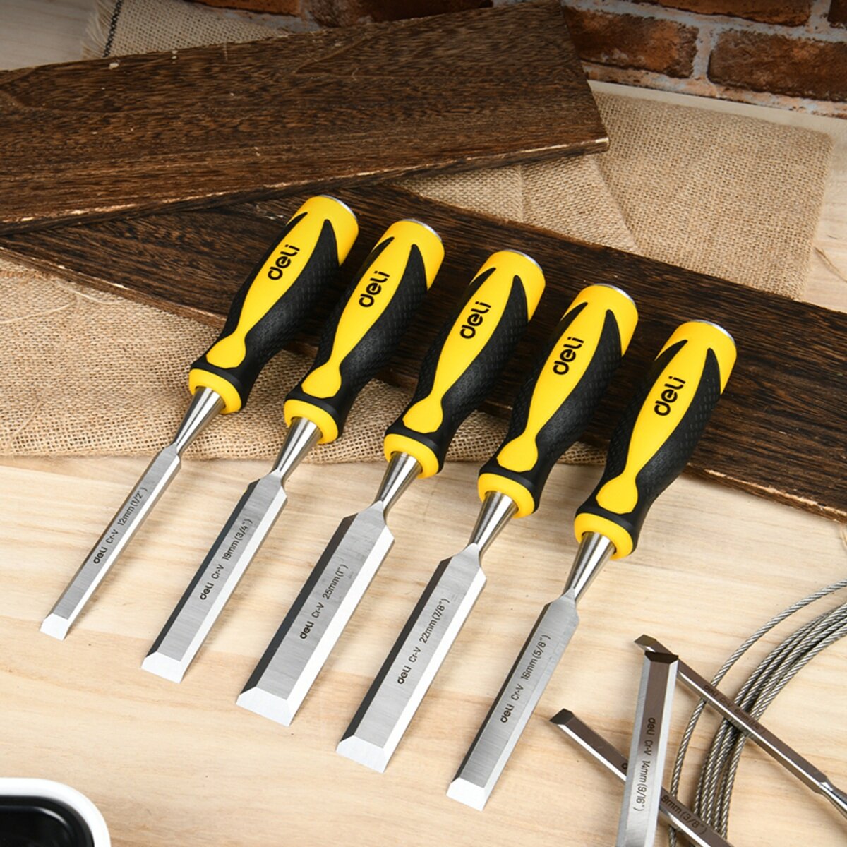 10 цен на Стамеска плоская 12мм Deli DL6212-E1 (CrV сталь, рабочая длина 140мм, угол заточки 25 град, прорезиненная рукоять)