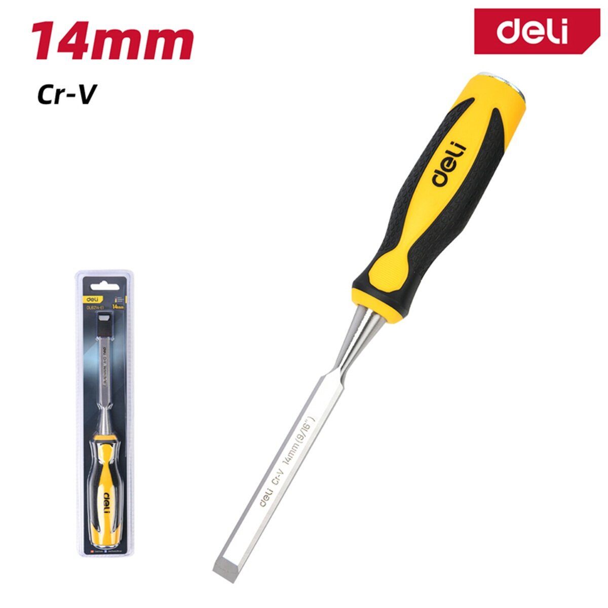 Стамеска плоская 14мм Deli DL6214-E1 (CrV сталь, рабочая длина 140мм, угол заточки 25 град, прорезиненная рукоять) информация:
